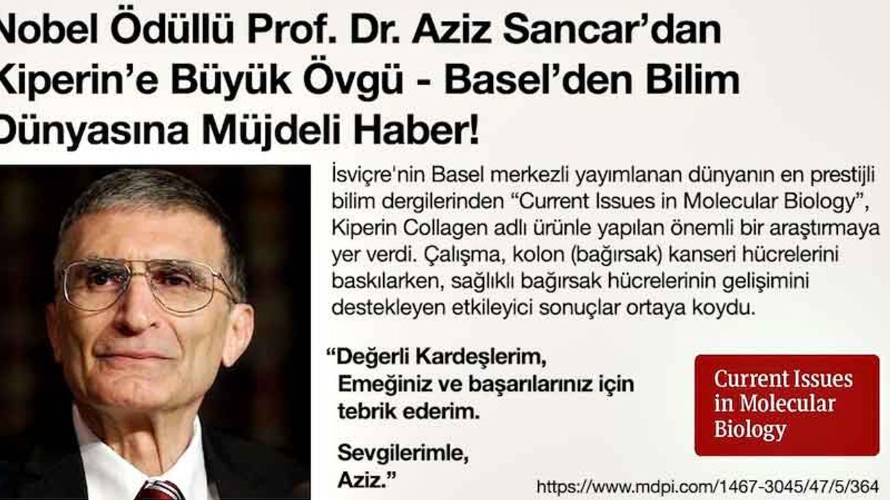 Zihin, ruh ve beden sağlığını desteklemek üzere 2019’dan bu yana bilim ve Ar-Ge’ye yatırım yapan ilaç şirketi Kiperin’in ‘Kiperin Collagen’ adlı ürününün bağırsak sağlığına ve kolon kanserine etkisi odağında gerçekleştirdiği araştırma, İsviçre merkezli prestijli bilim dergisi ‘Current Issues in Molecular Biology’de yayımlandı. Nobel Kimya Ödülü sahibi Prof. Dr. Aziz Sancar da sağlıklı bağırsak hücrelerinin gelişimi için sonuçlar ortaya koyan çalışmayı gerçekleştiren ekibe tebrik mesajı gönderdi.