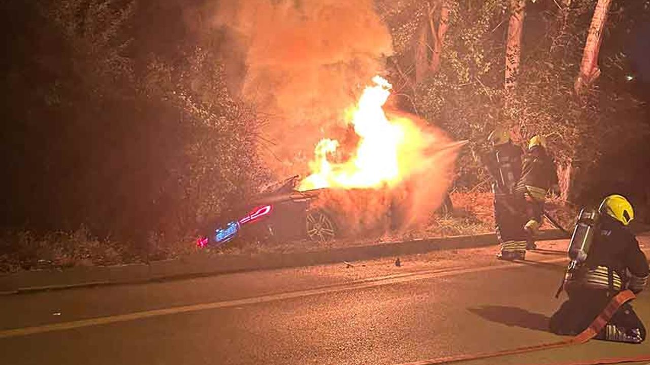 Bolu'da yol kenarındaki ağaçlara çarpan lüks otomobil, kazanın ardından alev alev yandı. Sürücü kazayı yara almadan atlatırken araç kullanılamaz hale geldi.