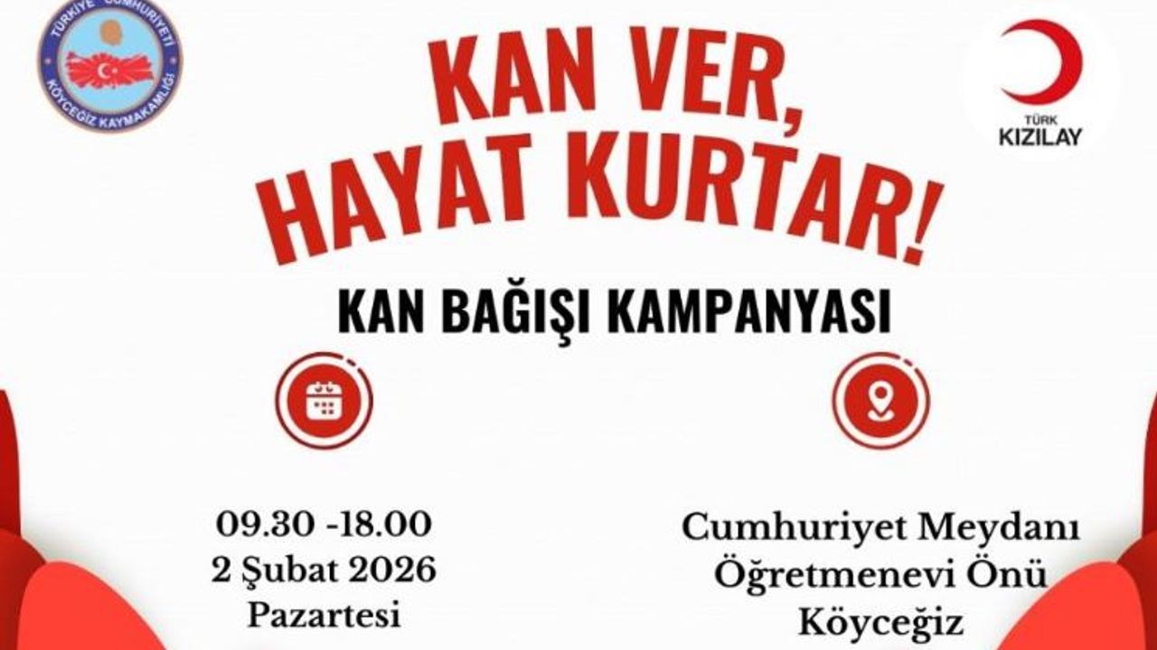 Köyceğiz Kaymakamlığı ile Türk Kızılay’ının ortaklaşa gerçekleştirdiği kampanya, vatandaşların kan bağışına teşvik edilmesini amaçlıyor. Kan bağışı kampanyası, 2 Şubat 2026 Pazartesi günü saat 09.30 ile 18.00 arasında Cumhuriyet Meydanı Öğretmenevi önü’nde yapılacak.