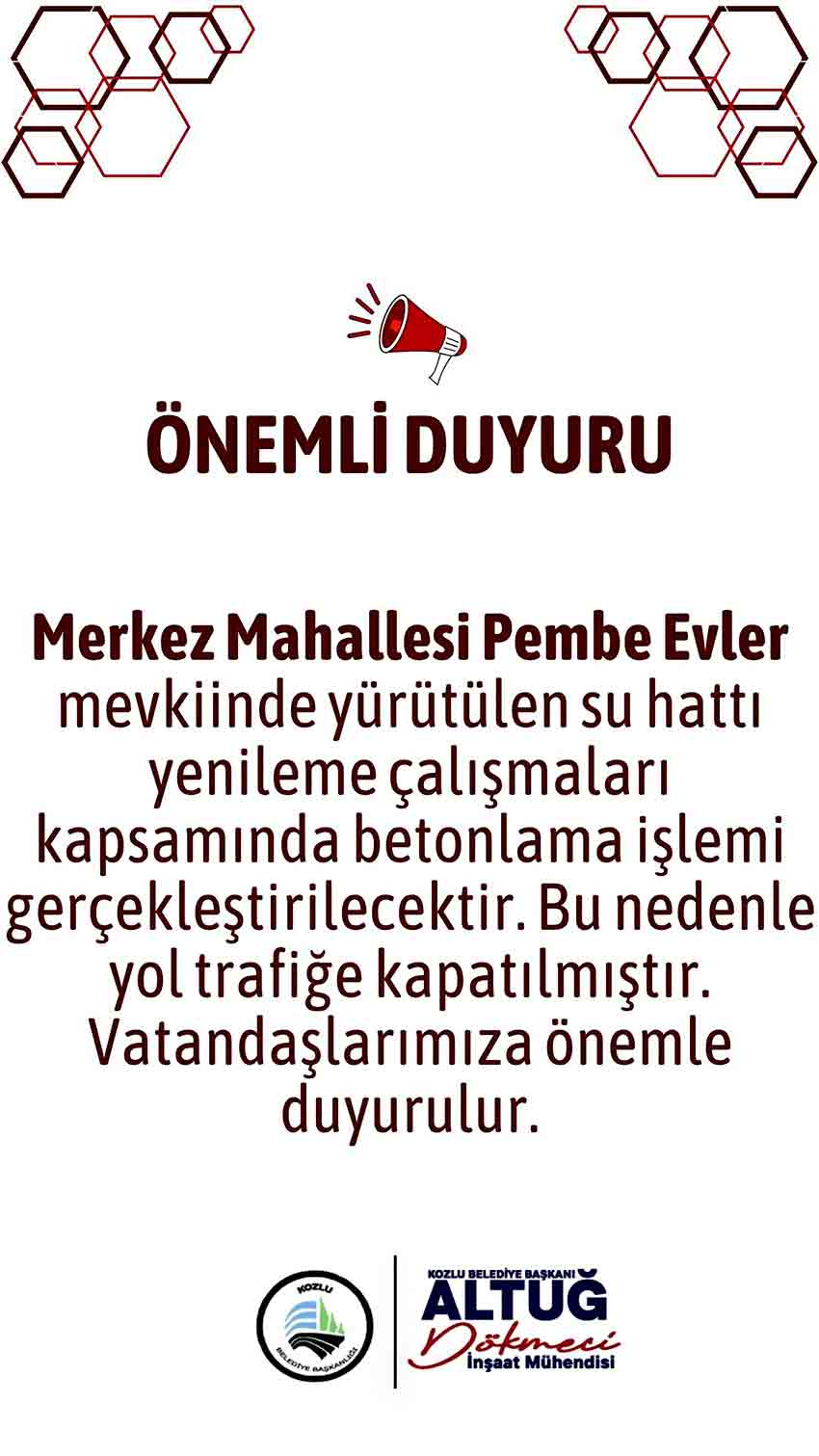 Kozlu Belediyesi, yürütülen çalışmalar nedeniyle belirli Merkez Mahallesi Pembe Evler mevkiinde su hattı yenileme çalılmalarından sd-dolayı geçici olarak araç trafiğine kapatıldığını açıkladı. Belediye yetkilileri, vatandaşların mağduriyet yaşamamaları için alternatif güzergâhları kullanmaları gerektiğini belirtti.
