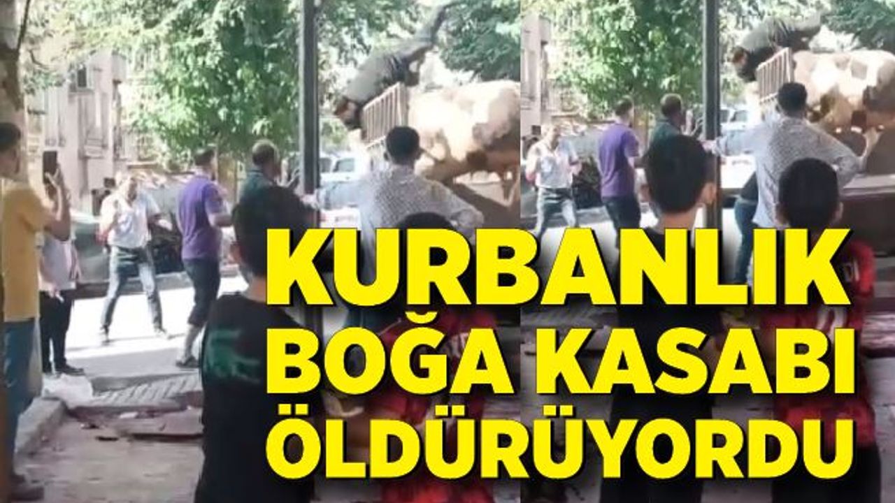 Şanlıurfa'da kamyonetten indirilmeye çalışılan kızgın boğa, kasaba kabusu yaşattı. Boğanın saldırısına uğrayan kasabın ölümden döndüğü anlar cep telefonu kamerasıyla kaydedildi.