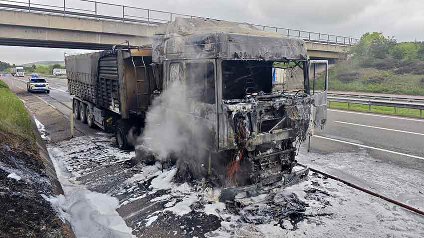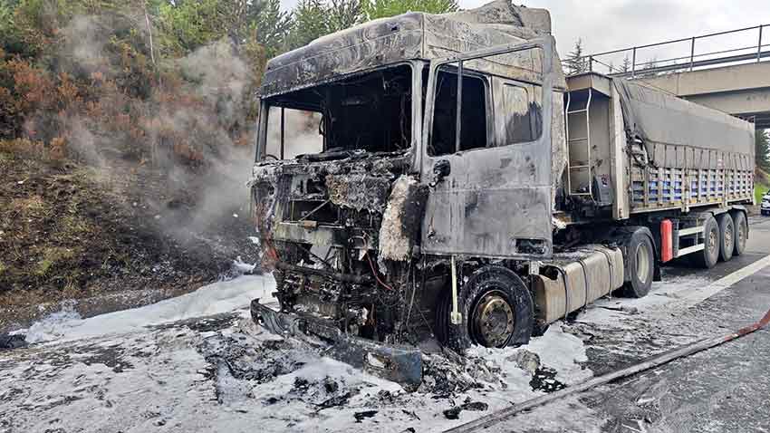 Yangın, sabah saatlerinde TEM Otoyolu’nun Akçakavak köyü mevkisinde meydana geldi. Edinilen bilgilere göre, M.Ç. (35) idaresindeki 67 LM 101 plakalı tırın sağ ön tekerleği patladı. Patlamanın ardından araçta yangın çıktı. Durumun bildirilmesi üzerine olay yerine itfaiye ekipleri sevk edildi. Ekiplerin hızlı müdahalesiyle yangın kısa sürede kontrol altına alındı. Yangın sebebiyle tır küle döndü.