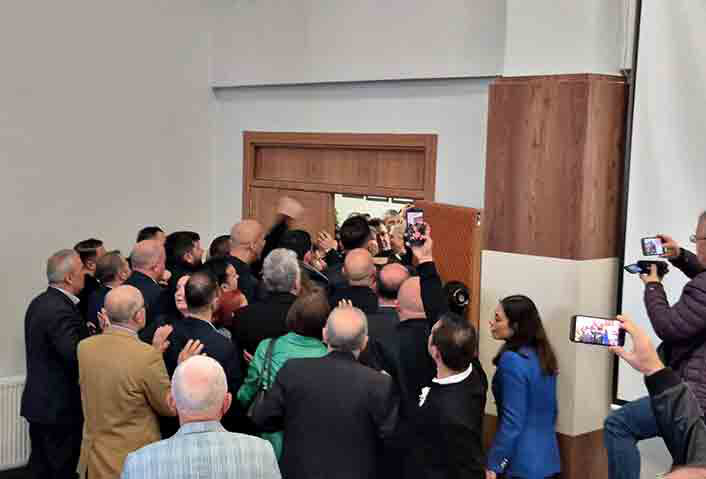 Seçimin ardından AK Partili üyeler toplantıya devam etmek üzere salona girmek isterken, CHP’lilerin engeliyle karşılaştı. Taraflar arasında yaşanan tartışmalar kısa sürede büyürken, salonda tansiyon yükseldi.