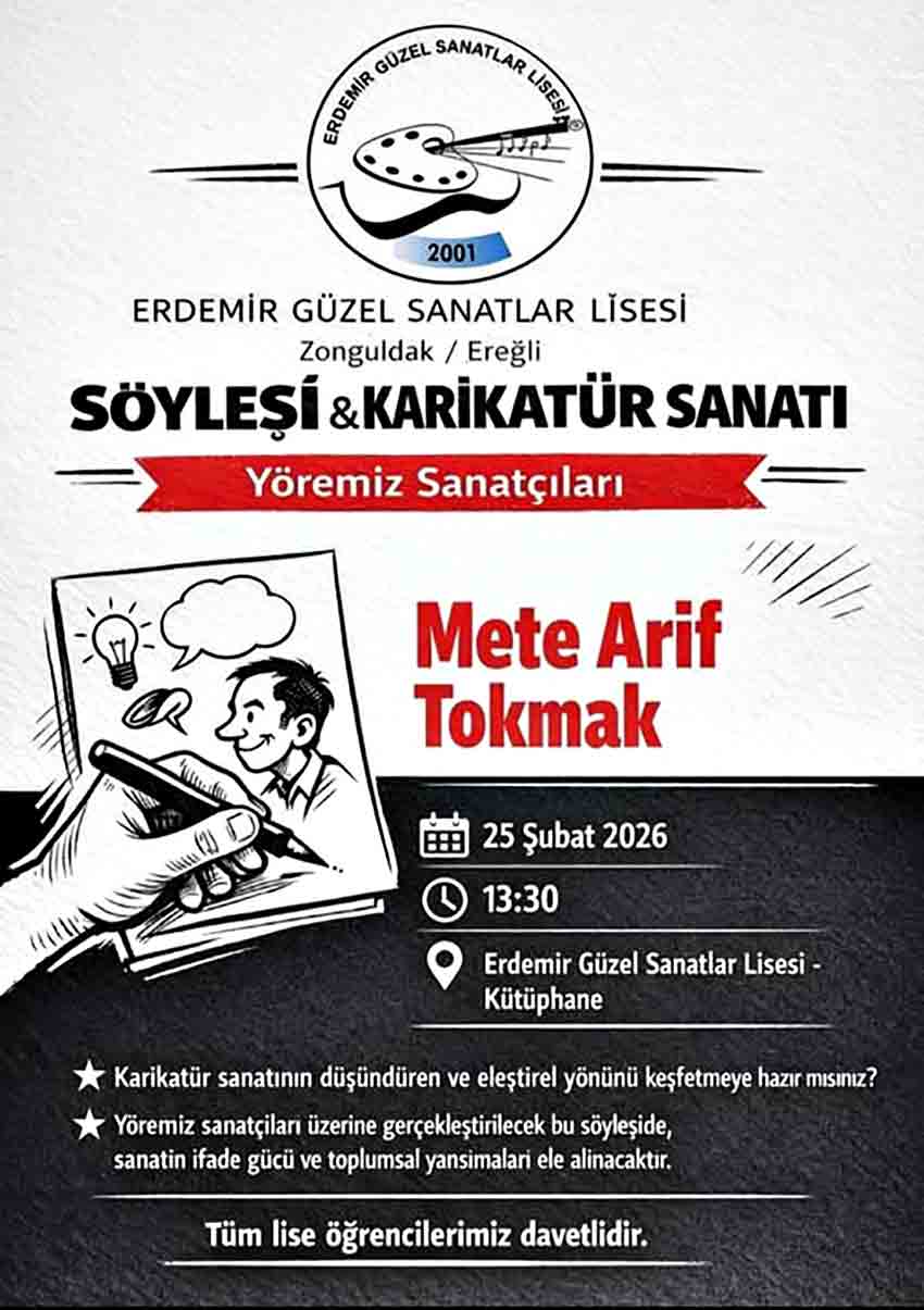 25 Şubat 2026 günü yapılacak olan söyleşi programına tüm lise öğrencilerinin davetli olduğu belirtildi. Söyleşi saat 13.30’da Erdemir Güzel Sanatlar Lisesi kütüphanesinde gerçekleşecek.