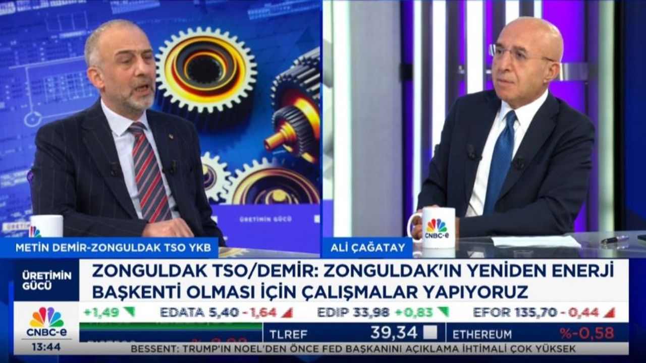 Başkan Demir; “ CNBC- e kanalında Sayın Ali Çağatay’ın sunumları ile gerçekleşen “Üretimin Gücü “programına canlı yayın konuğu olarak katılım sağladık. Programda, Zonguldak Ticaret ve Sanayi Odası olarak, Ülke ve İlimiz ekonomisinin güçlenmesi, istihdamın artırılması, sektörel çeşitliliğin sağlanması, turizm olanaklarının artırılmasına yönelik yaptığımız çalışmalardan bahsettik. Bölgemizin mega projesi olan Filyos Vadi Projesi’nin sağladığı avantajlar ve proje ile meydana gelen yeni potansiyel yatırım alanları ve yeni sektörler hakkında bilgiler verdik. Moderatör ve sunucu Ali Çağatay’ın sorularını cevapladık.