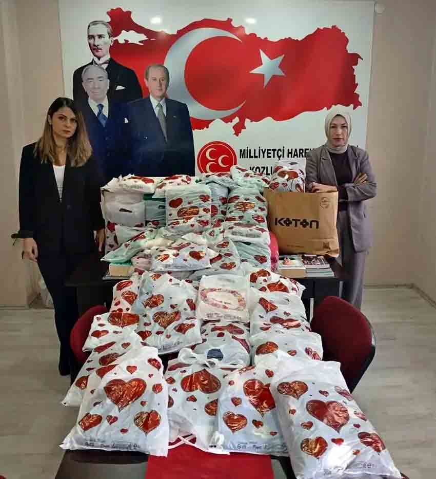 Milliyetçi Hareket Partisi (MHP) Kozlu İlçe Başkanlığı, sosyal sorumluluk faaliyetleri kapsamında ihtiyaç sahibi çocuklara destek olmaya devam ediyor. KAÇEP (Kadın, Aile, Çocuk ve Engelli Politikaları) Başkanı Nurcan Akbulut ve Başkan Yardımcısı Dilek Karali öncülüğünde gerçekleştirilen çalışma kapsamında, 6-9 ay ve 12-13 yaş aralığında bulunan 30 çocuğa kıyafet desteği verildi.