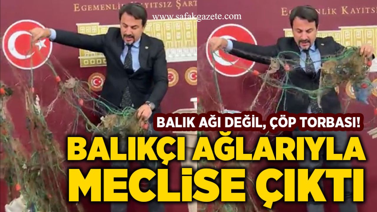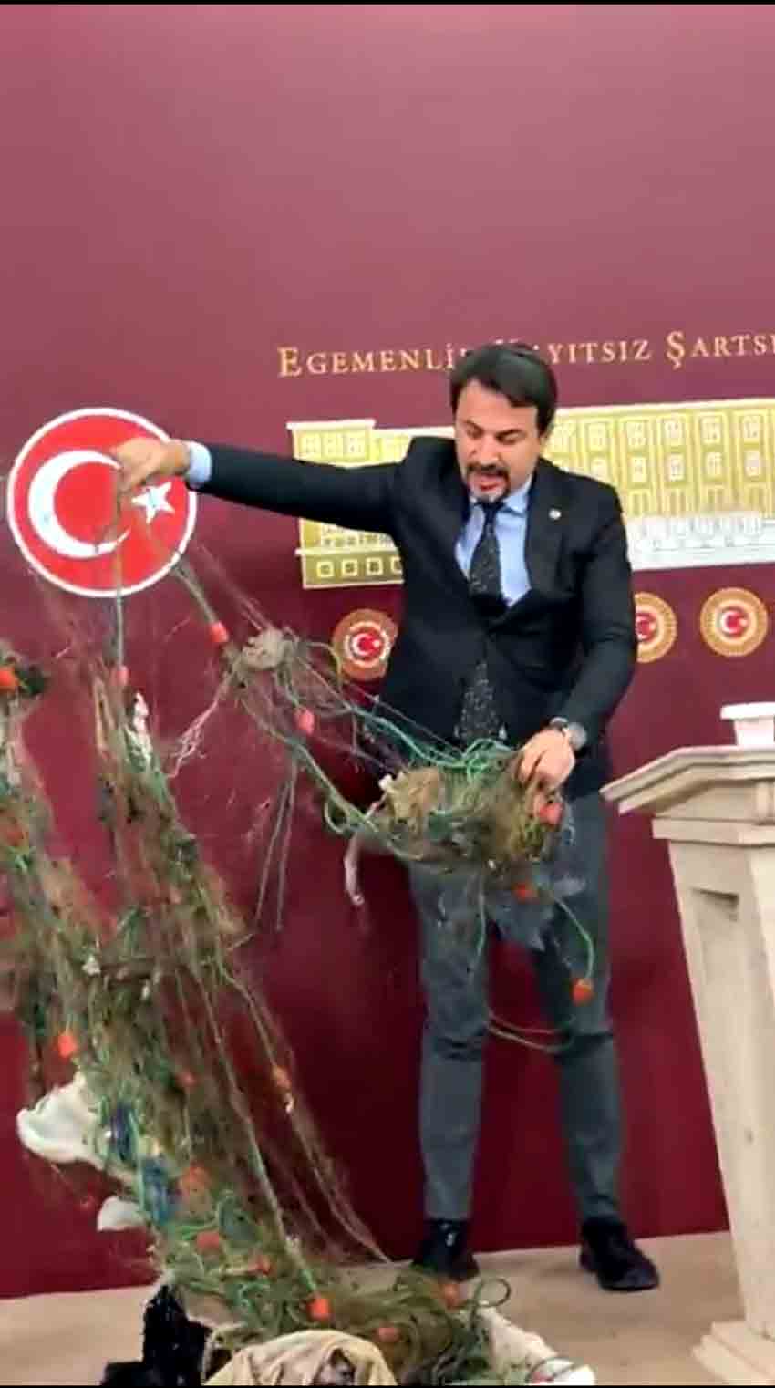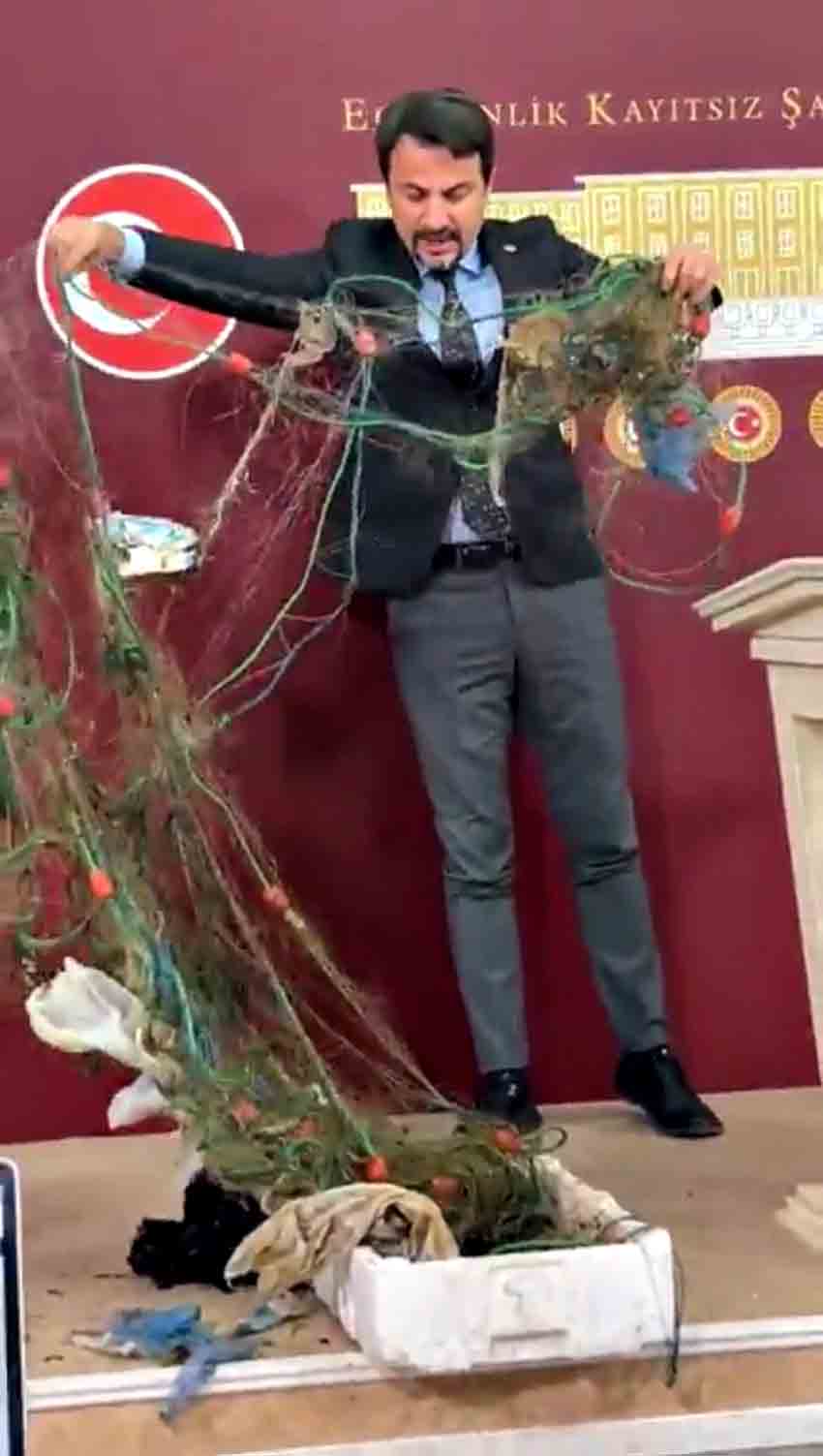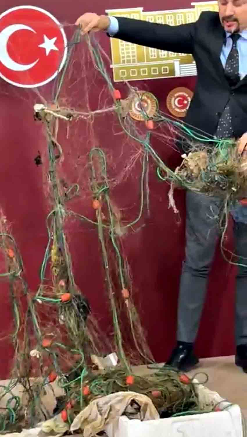 Basın açıklamasında balıkçı ağlarını gösteren Ertuğrul, ağların denizden çıkan atıklarla dolu olduğunu vurgulayarak şunları söyledi: