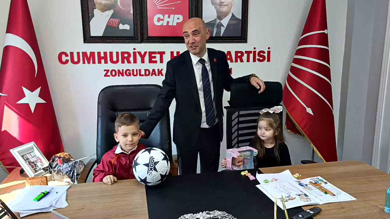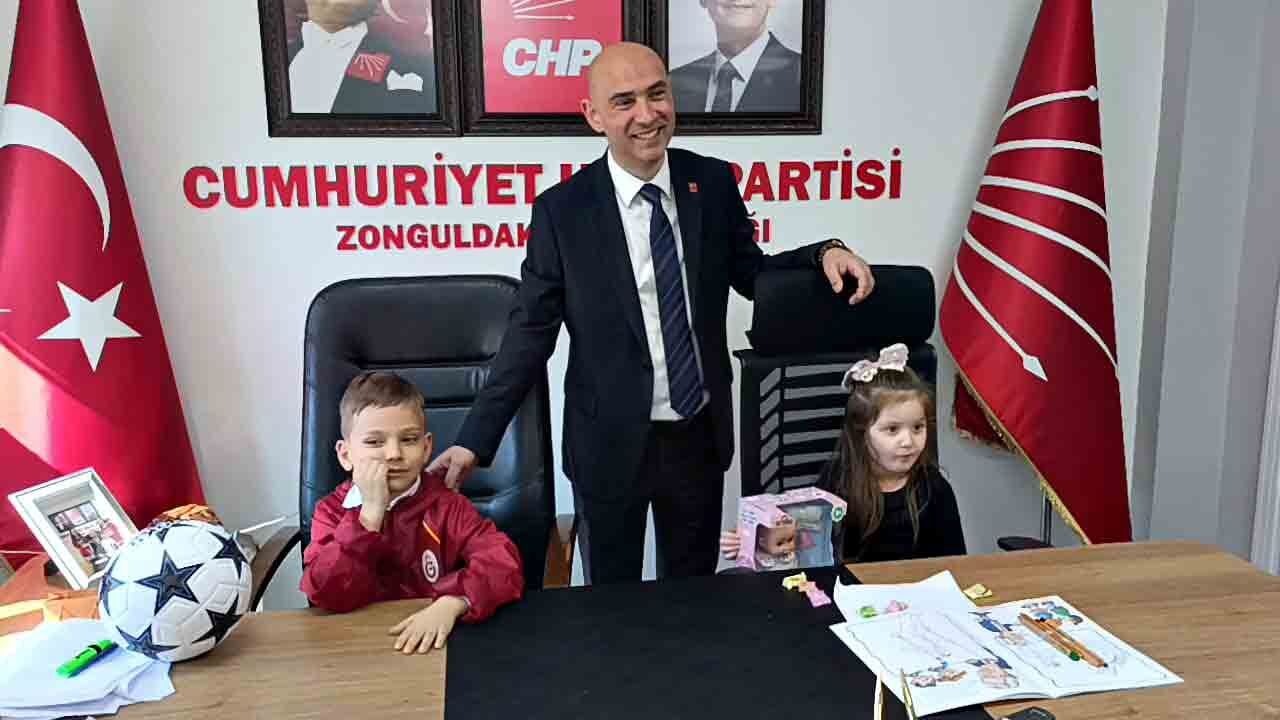 CHP Zonguldak İl Başkanı Devrim Dural, 23 Nisan etkinlikleri kapsamında makam koltuğunu temsili olarak öğrencilere devretti. Bu çerçevede il başkanlığı koltuğuna Masal Su Ateş (4) ve Mevlüt Bahadır (6) kısa süreliğine oturdu.