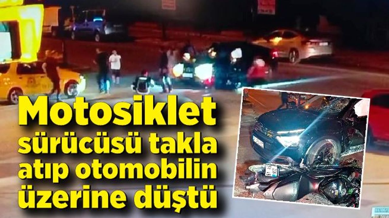 Şehir merkezinde meydana gelen kazada caddede dönmeye çalışan otomobil ile motosiklet çarpıştı. Kazada dönüş yapmaya çalışan otomobile çarpan motosiklet sürücüsü takla atıp otomobilin üzerine oturdu. Motosiklet sürücüsü şoku atlatınca yaralandığını fark etti. Kaza anı ise güvenlik kameralarınca anbean kaydedildi.