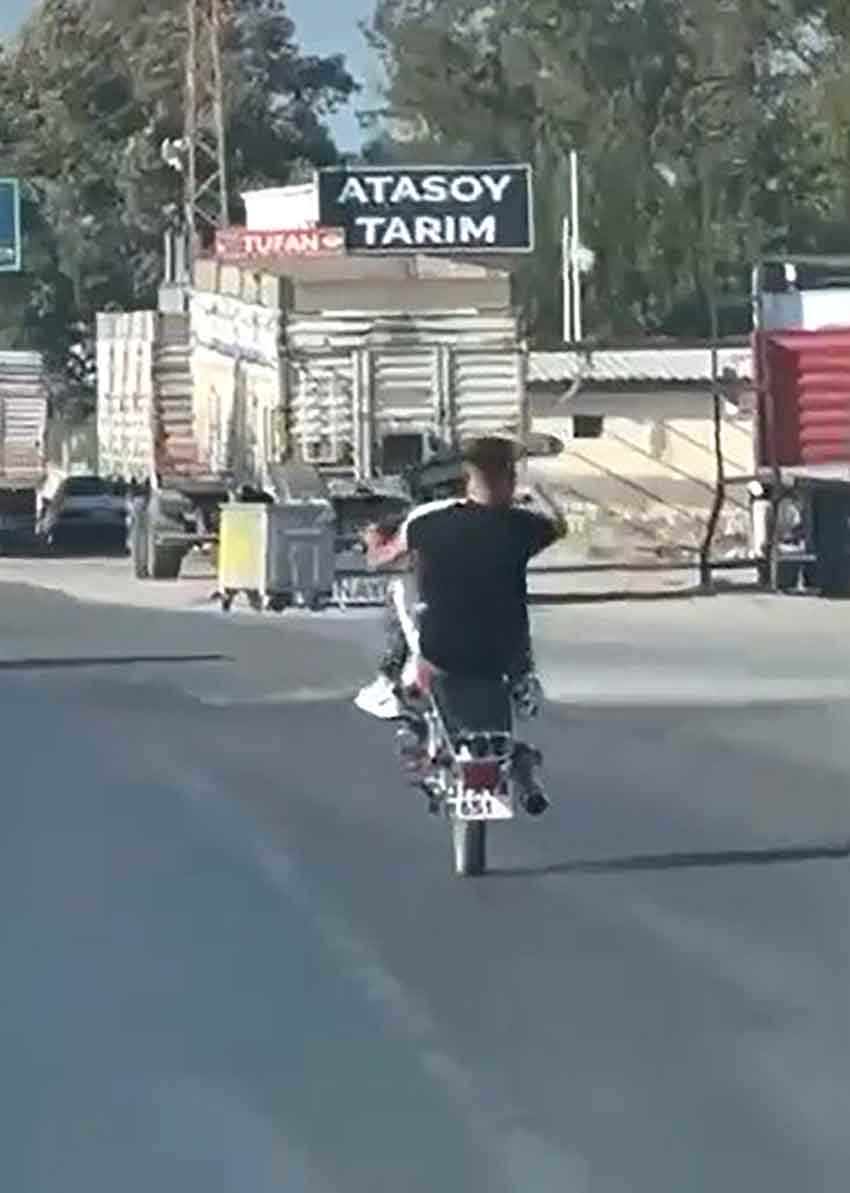 Hatay’da motosikletle 5 saniyelik akrobatik hareketler yaparak trafiği tehlikeye sokan sürücüye 21 bin 837 TL cezai işlem uygulandı ve aracı trafikten men edildi.