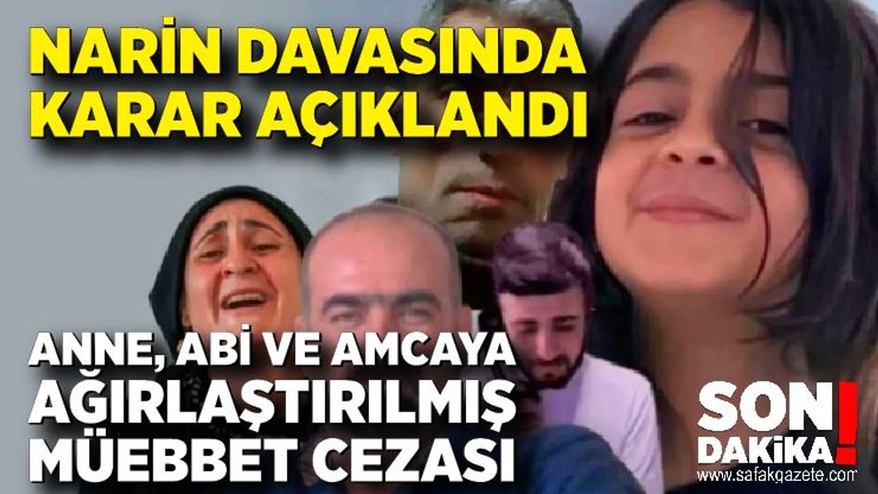 Diyarbakır'da kaybolduktan 19 gün sonra cesedi bulunan Narin Güran cinayeti davasında karar açıklandı.Tutuklu yargılanan amca Salim Güran, anne Yüksel Güran, ağabey Enes Güran ağırlaştırılmış müebbet hapis cezasına çarptırıldı.Tutuklu yargılanan Nevzat Bahtiyar 4 yıl 6 ay hapis cezası ile cezalandırıldı.