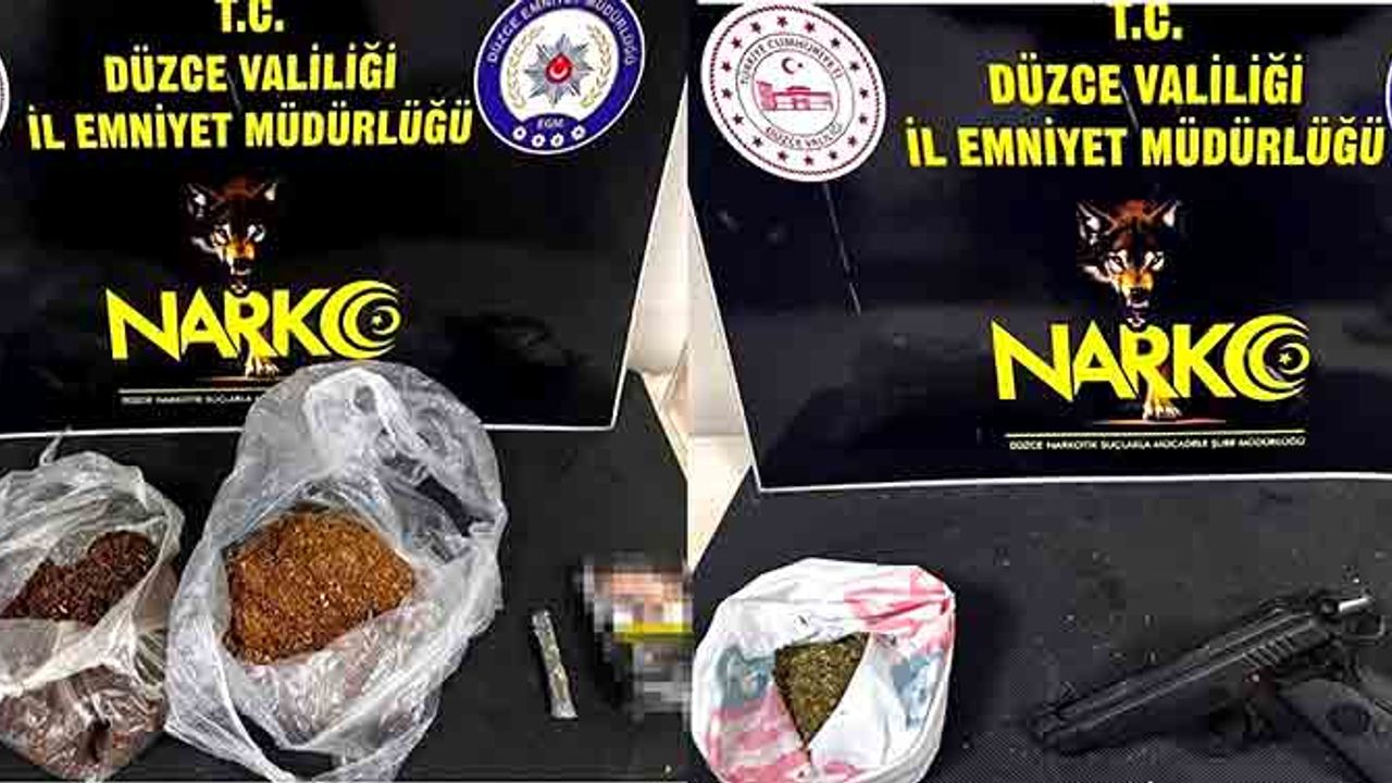 Düzce Cumhuriyet Başsavcılığı koordinesinde Narkotik Suçlarla Mücadele Şube Müdürlüğü ekiplerince 2 şahsın yakalanmasına yönelik Çay ve Derelitütüncü mahallelerinde operasyon düzenlendi. Operasyonda 5 parça halinde 230 gram sentetik kannabinoid maddesi, hassas terazi ve ruhsatsız tabanca ele geçirildi.