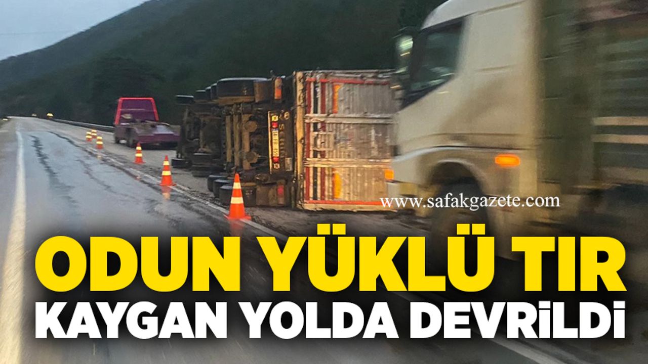 Bolu'nun Göynük ilçesinde odun yüklü tır kayganlaşan yolda devrildi.