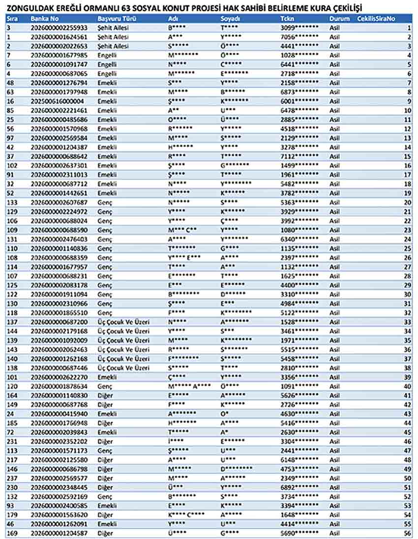 Gerçekleştirilen kura çekiminde EREĞLİ İLÇESİ ORMANLI BELDESİ TOKİ HAK SAHİPLERİ LİSTESİ