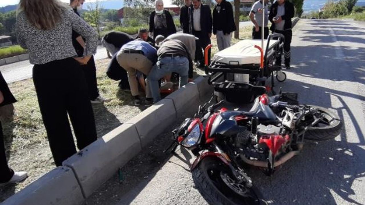Bolu’nun Mudurnu ilçesinde otomobile çarpmamak için ani fren yapan motosiklet sürücüsü hastane önünde yola devrilerek yaralandı. Yaralı sürücü hastaneye sedye ile götürüldü.