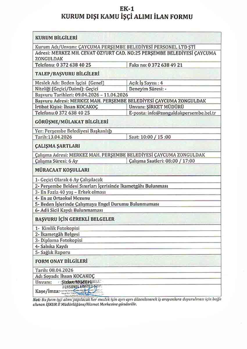 Çaycuma ilçesine bağlı Perşembe beldesinde belediye bünyesinde çalıştırılmak üzere personel alımı yapılacağı duyuruldu.