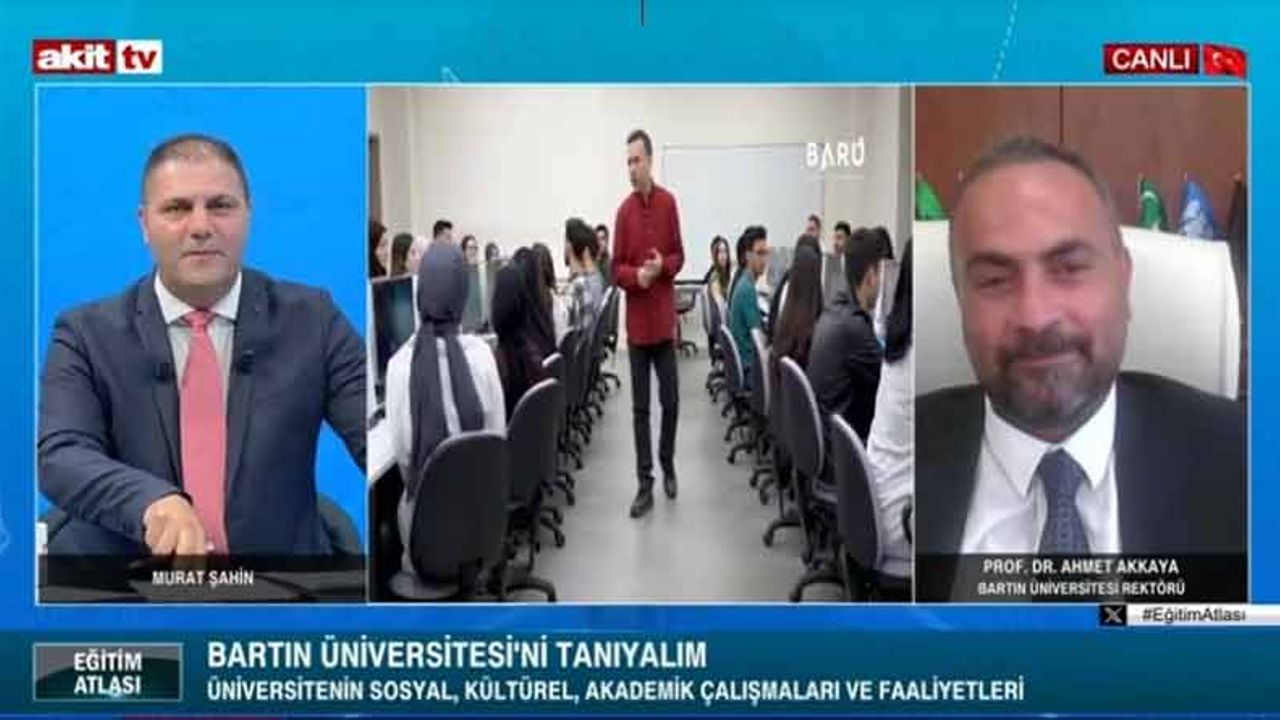 Bartın Üniversitesi (BARÜ) Rektörü Prof. Dr. Ahmet Akkaya, Akit TV'de "Eğitim Atlası" programının canlı yayın konuğu oldu. Murat Şahin'in sunuculuğunu yaptığı programda soruları cevaplayan Rektör Prof. Dr. Ahmet Akkaya, BARÜ'nün yeni açılan programları başta olmak üzere sunulan imkânlar hakkında bilgi verdi.
