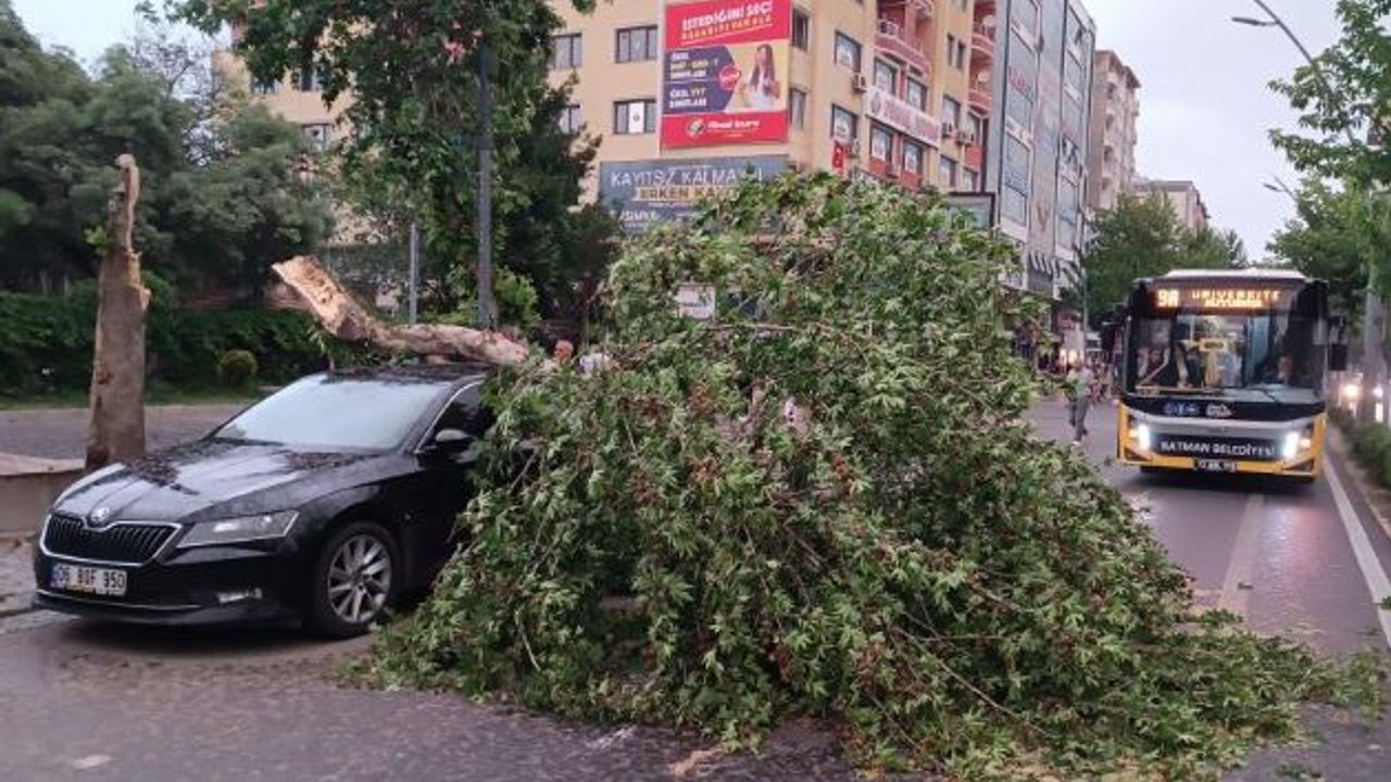 Batman'da etkili olan şiddetli rüzgar nedeniyle devrilen ağaç, park halinde bulunan aracın üzerine düştü.