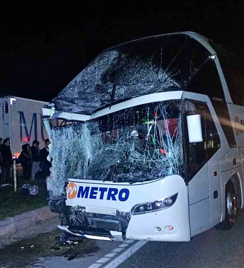 Kaza, Merzifon–Samsun karayolu üzerinde sabaha karşı saat 04.00 sıralarında meydana geldi. Edinilen bilgilere göre Metro Turizm’e ait 06 FTD 788 plakalı yolcu otobüsü, henüz bilinmeyen bir nedenle 16 R 7736 plakalı tıra arkadan çarptı.