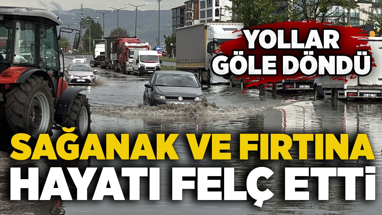 Bolu'da aniden bastıran sağanak yağış ve fırtına, hayatı olumsuz etkiledi. Birçok ara sokak adeta göle dönerken, yaklaşık 8 metrelik bir ağaç fırtına sebebiyle araçların üzerine devrildi.