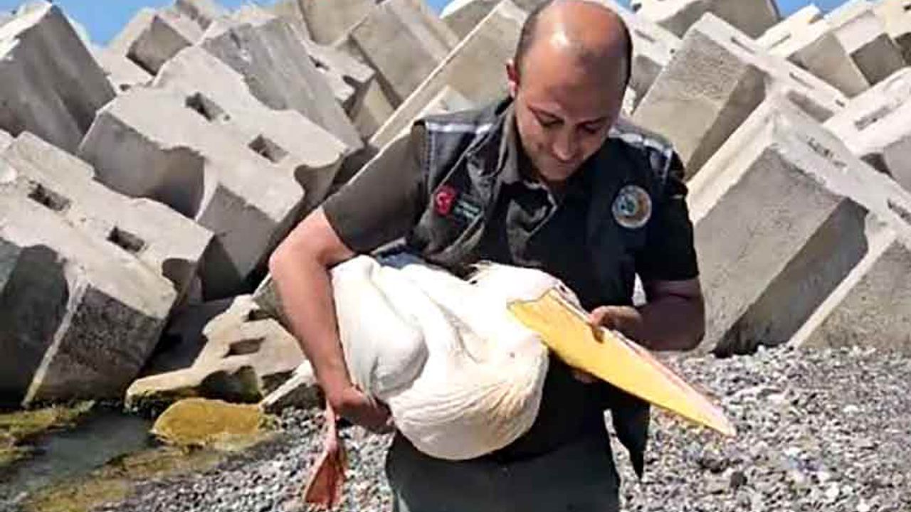 Kastamonu'da yaralı halde sahile vuran pelikan tedavi altına alındı.
