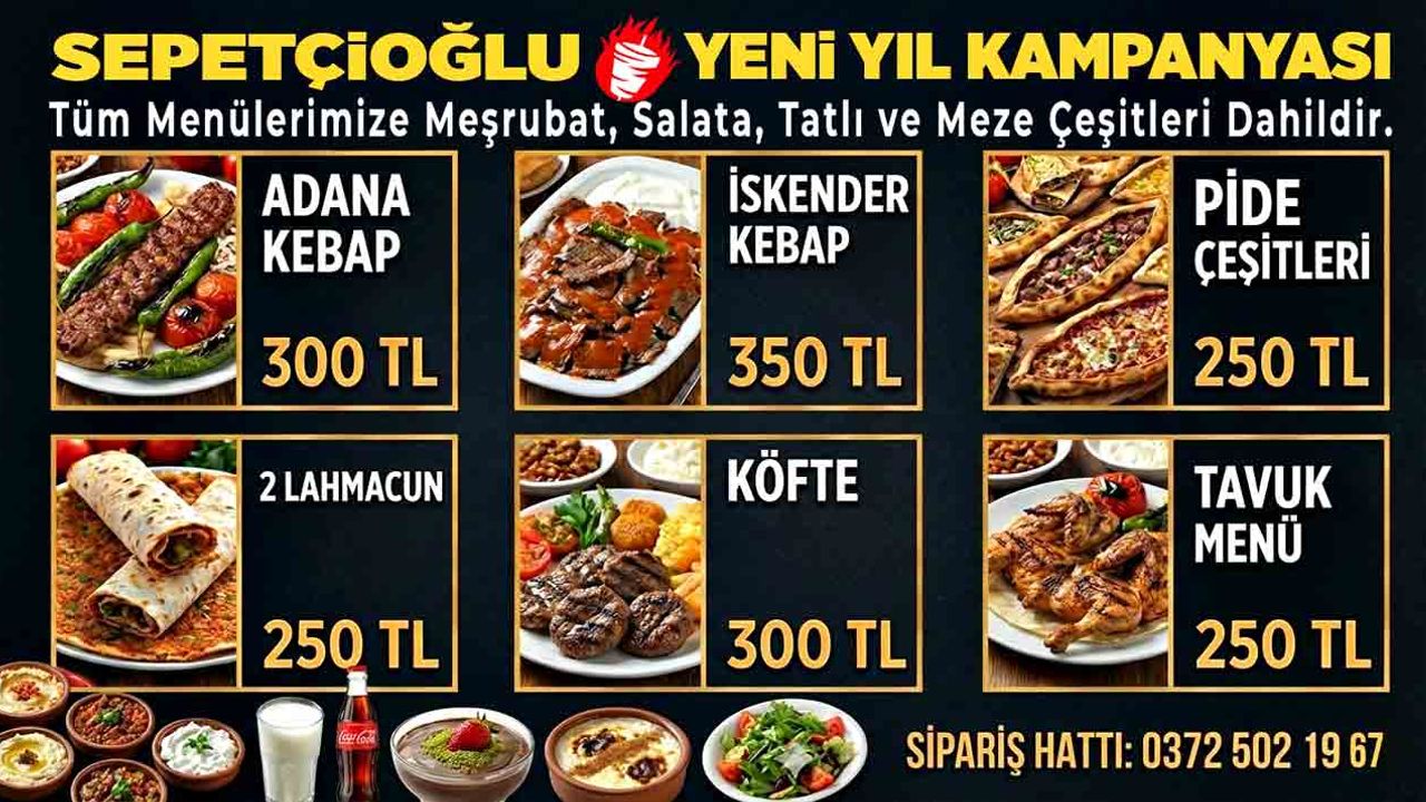 Yıl sonuna özel hazırlanan ve yeni yılda da devam edecek olan kampanyada, sofralar adeta bir ziyafet şölenine dönüşüyor. Sepetçioğlu Kebap, hazırladığı tüm fix menülerin yanında meşrubat, zengin meze çeşitleri, mevsim salatası ve tatlıyı ikram olarak sunarak müşteri memnuniyetini en üst seviyeye taşıyor.