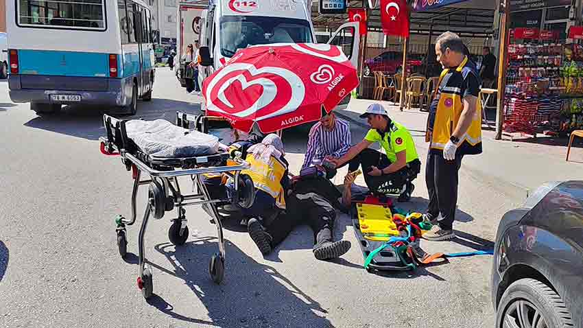 Karabük'te seyir halindeki motosikletin çarptığı vatandaş ile motosikletteki yolcu yaralandı. Yolda yatan yaralıyı, çevredeki esnaf güneşten şemsiye yardımı ile korudu.