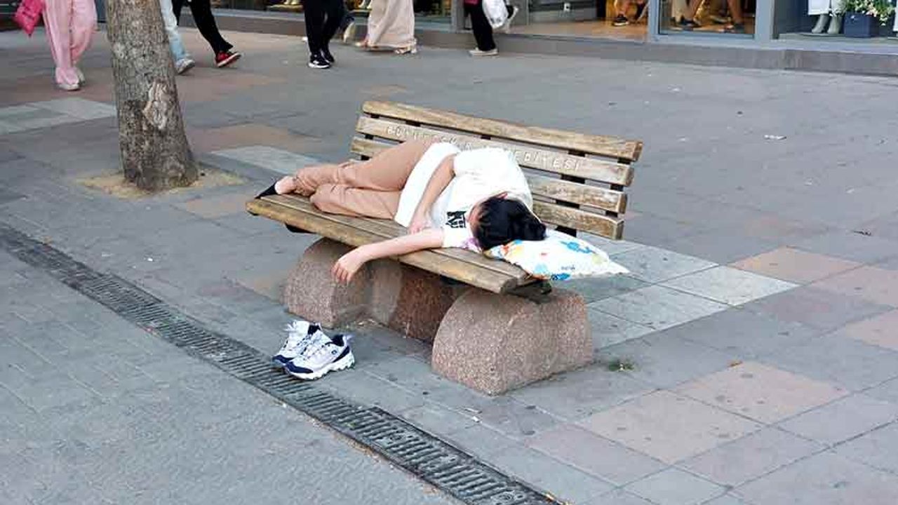 Eskişehir'de sıcaktan bunalan bir gencin şehrin en işlek caddesi üzerindeki bir bankta uzanıp uyuması ilginç bir görüntü oluşturdu.