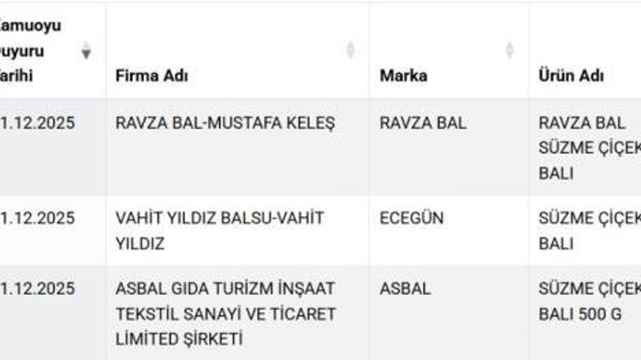 Bakanlığın yayımladığı listeye göre; Gümüşhane'nin Kelkit ilçesinde faaliyet gösteren ‘Ravza Bal -Mustafa Keleş' firmasına ait ‘Ravza Bal Süzme Çiçek Balı', Ankara'nın Akyurt ilçesindeki ‘Vahit Yıldız Balsu -Vahit Yıldız' firmasına ait ‘Ecegün Süzme Çiçek Balı', Bursa Nilüfer'deki Asbal Gıda Turizm İnşaat Tekstil Sanayi ve Ticaret Ltd. Şti. firmasına ait ‘Asbal Süzme Çiçek Balı 500 G', ürünlerinde taklit veya tağşiş yapıldığı belirlendi.