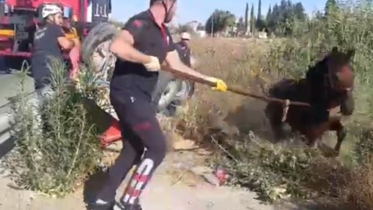 Şanlıurfa’nın Haliliye ilçesinde tahliye kanalına düşen at, itfaiye ekipleri tarafından kurtarıldı.