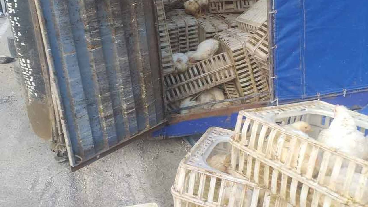 Bolu'da virajı alamayan Erpiliç firmasına ait canlı tavuk nakil kamyonu devrildi. Kazada sürücü yaralanırken, yüzlerce tavuk telef oldu.