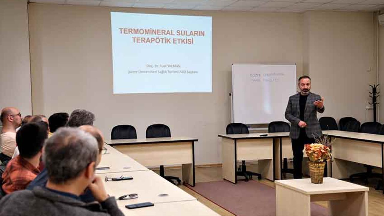 Etkinliğe davetli konuşmacı olarak katılan Düzce Üniversitesi İşletme Fakültesi Sağlık Yönetimi Bölümü Öğretim Üyesi Doç. Dr. Fuat Yalman, termomineral suların tedavi edici etkilerine dair kapsamlı bir sunum yaptı. Termal ve termomineral sular arasındaki farkları anlatan Yalman, bu suların uygulama yöntemleri ve etki mekanizmalarını detaylandırdı. Termal suların, kaldırma kuvveti, viskozite, termik ve kimyasal etkiler, penetrasyon ve flüsyon gibi etki mekanizmaları olduğunu söyleyen Yalman, termomineral suların kimyasal özelliklerine de değindi.