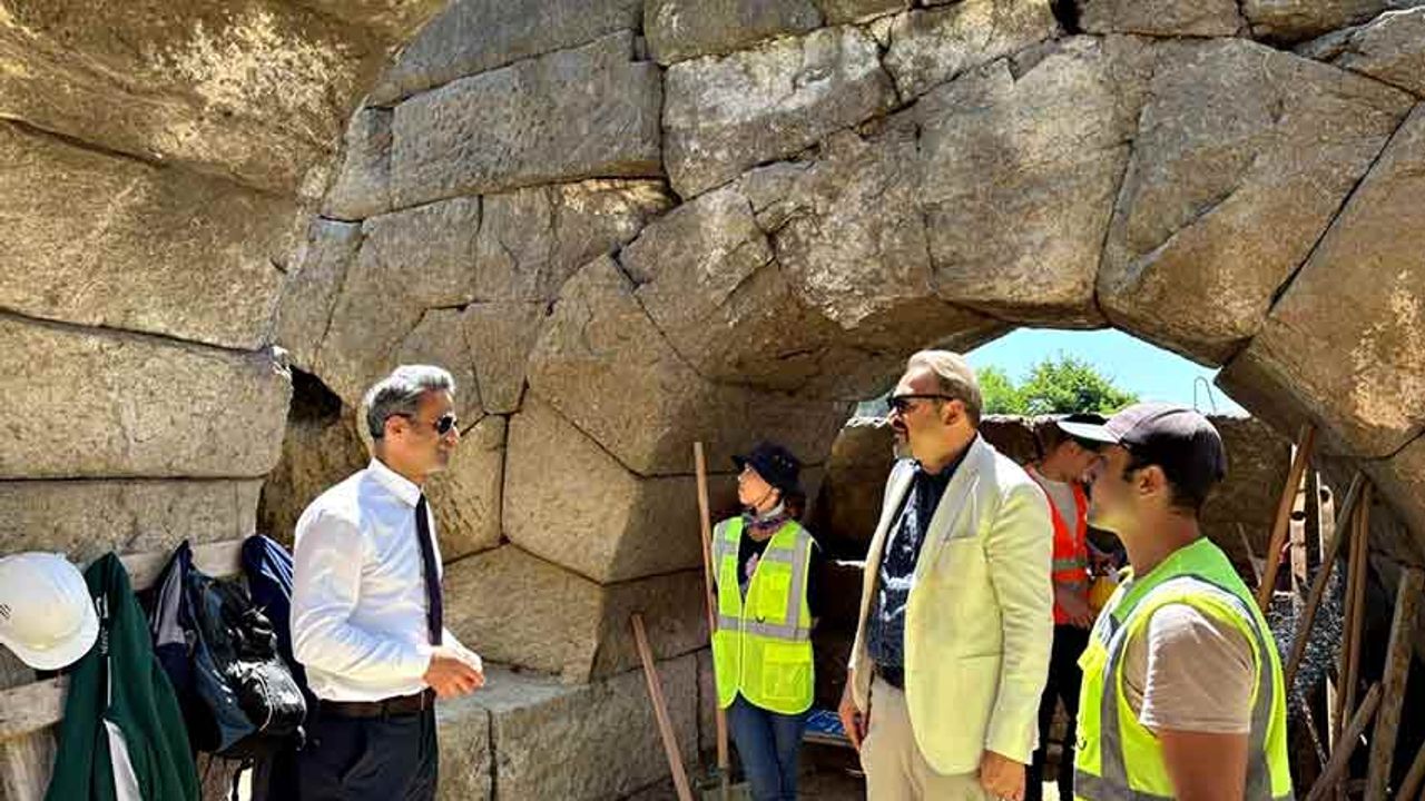 İncelemeler sırasında Prof. Dr. Şahin Yıldırım, Kaymakam Kaya’ya kazı sürecine ilişkin teknik bilgiler vererek, antik tiyatronun tarihi önemi ve restorasyon süreci hakkında ayrıntılı sunumda bulundu.