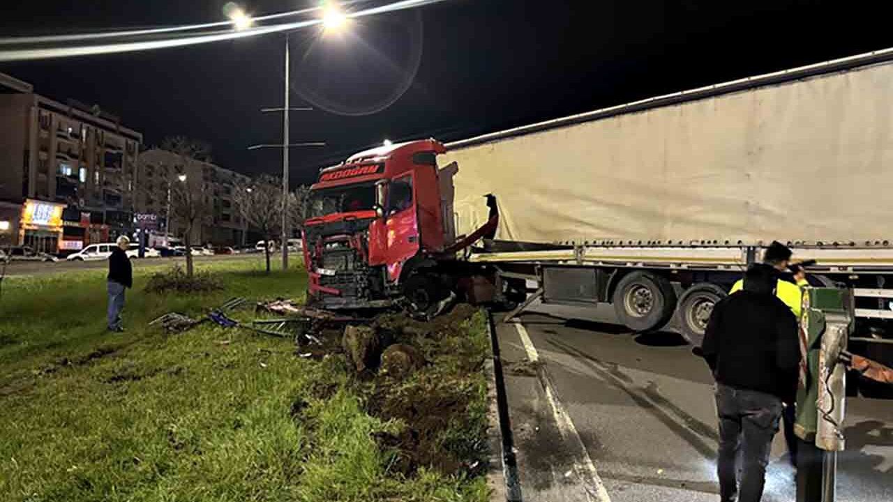 Sürücünün direksiyon hakimiyetini kaybetmesiyle tır refüje çıkarak durabildi. Olası bir facianın eşiğinden dönülen kazada büyük panik yaşandı.