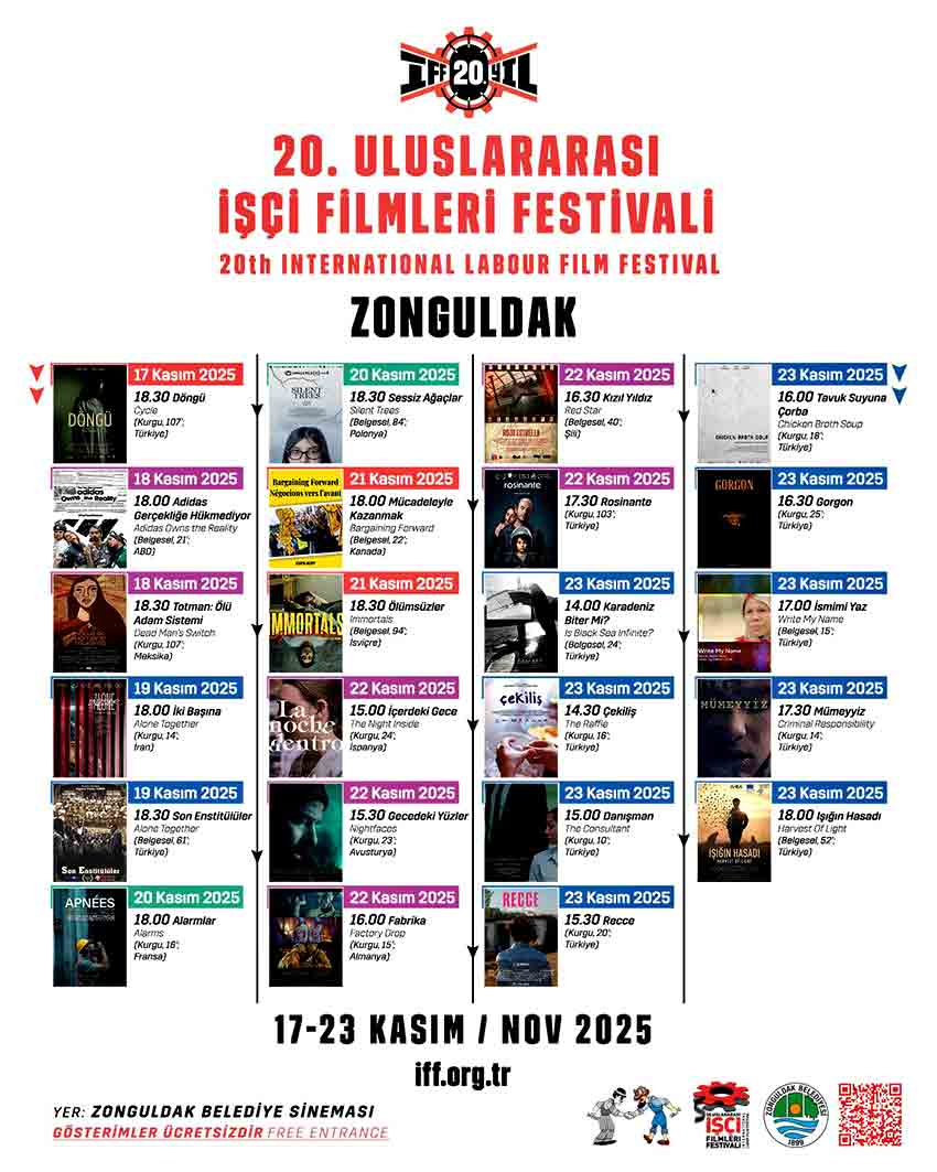 20. İşçi Filmleri Festivali Zonguldak'ta perdelerini açıyor. Zonguldak Belediye Sineması'nda yapılacak festival 17 Kasım'da başlayacak ve 23 Kasım’a kadar sürecek.