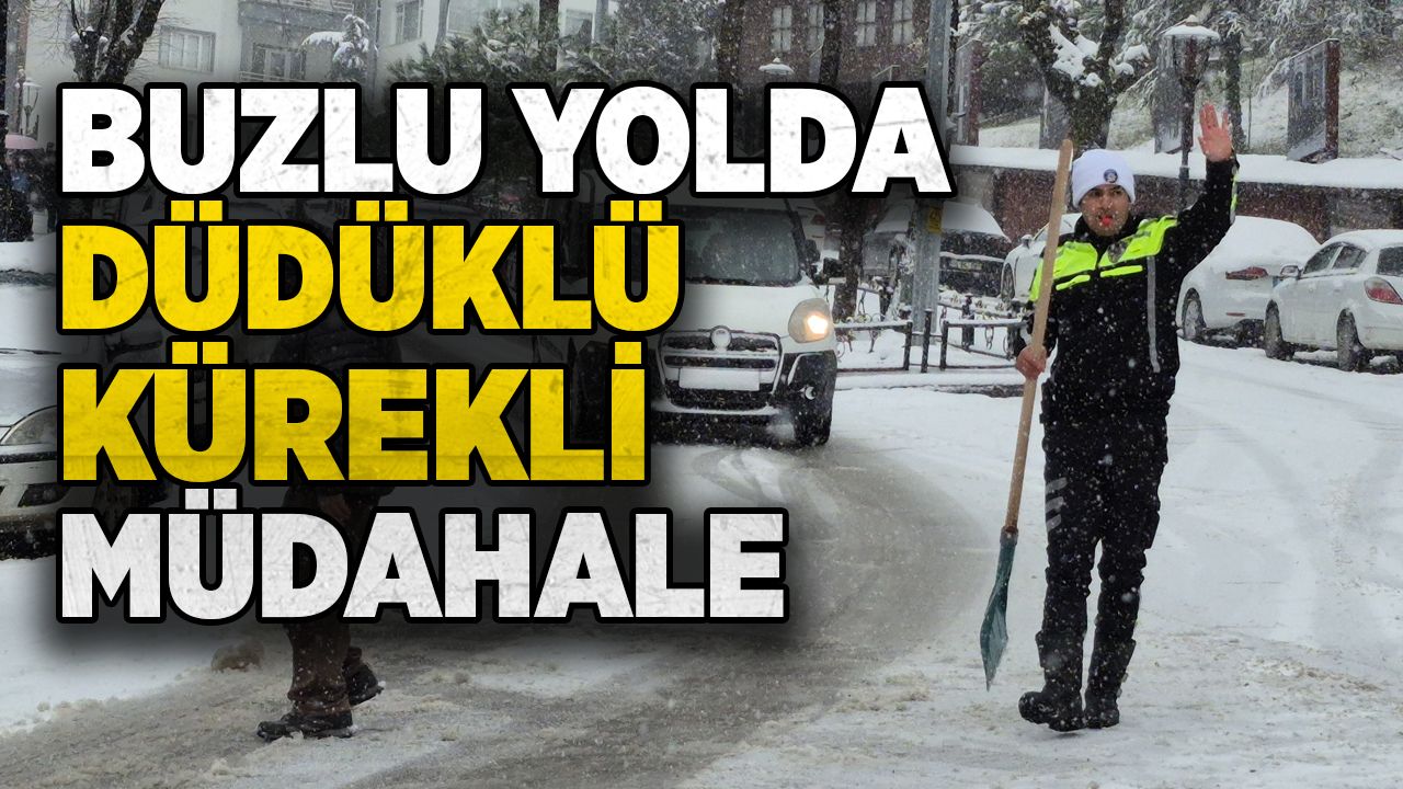 Bartın'da buzlu yolda ağzında düdükle trafiği yönlendiren polis, elindeki kürekle de kar temizledi. Yürek ısıtan o anlar kameraya yansıdı.