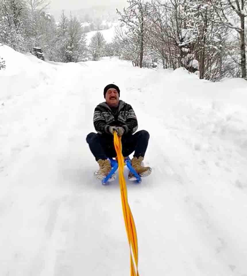 Köy yollarının karla kaplanmasının ardından çocuklar, ailelerinin gözetiminde traktörün arkasına iple bağlanan kızaklarla kayak yaptı. Bazı gençler ise otomobilin arkasına bağladıkları kızaklarla karlı yollarda kayarak eğlenceli anlar yaşadı.