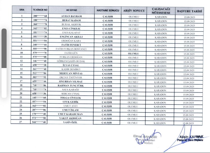 İşe başlamaya hak kazanan adayların 15.09.2025 tarihinde, isimlerinin karşısında belirtilen Müessese Müdürlüklerinin Personel Şube Müdürlüklerinde saat 08.00’de hazır bulunmaları gerekmektedir.