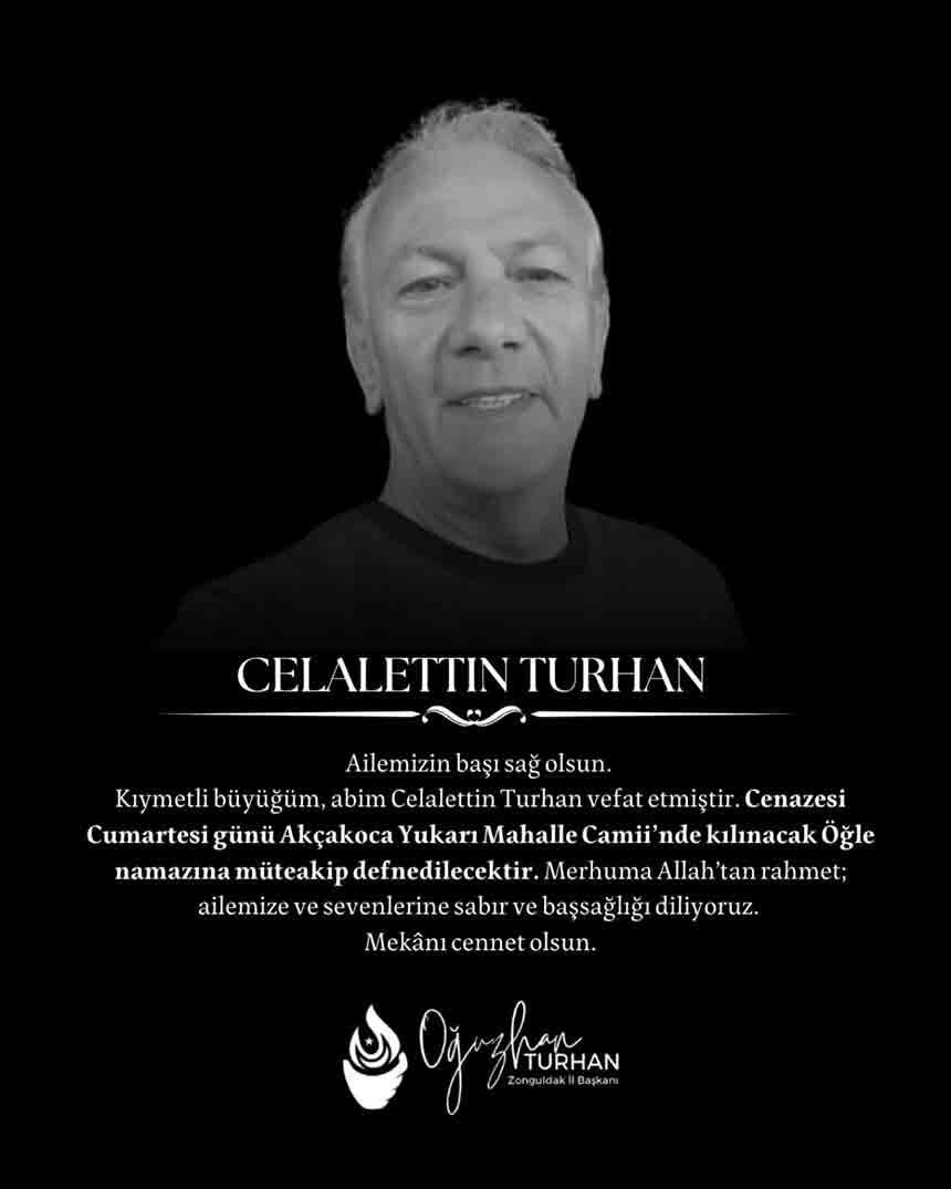 Oğuzhan Turhan, acı haberi sosyal medya hesabından yaptığı paylaşımla duyurdu. Turhan paylaşımında, “Kıymetli büyüğüm, abim Celalettin Turhan vefat etmiştir” ifadelerine yer verdi.