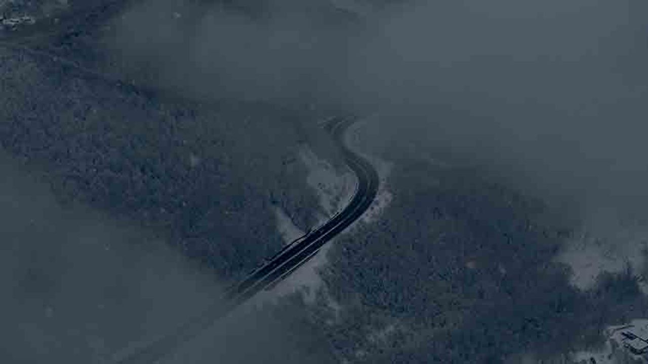 Karla kaplanan ormanlık alanlar ve çam ağaçlarının beyaz örtüyle bütünleştiği manzara, iki ana ulaşım aksının aynı karede yer almasıyla dikkat çekti. Oluşan görüntüler havadan kayıt altına alındı.