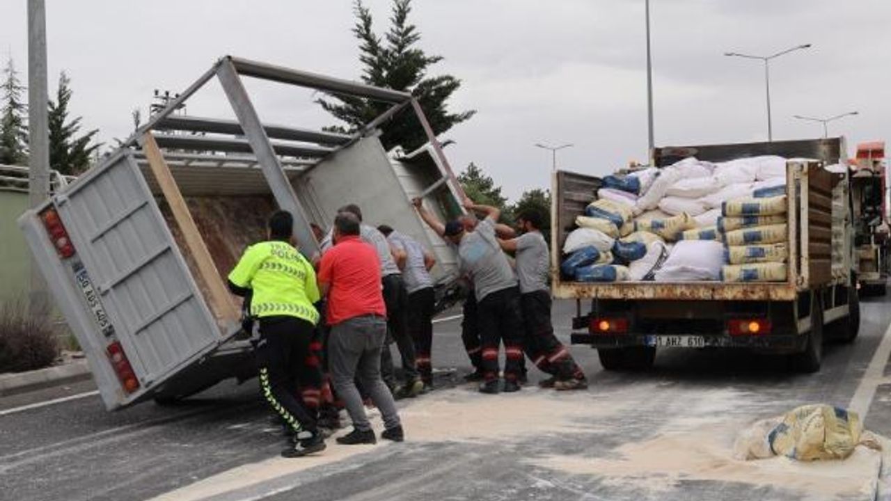 Nevşehir'de kontrolden çıkan un yüklü kamyonet yol ortasına devrildi. Kazada 2 kişi yaralanırken, kaza sonrası devrilen kamyonet temizlik işçileri tarafından düzeltildi.