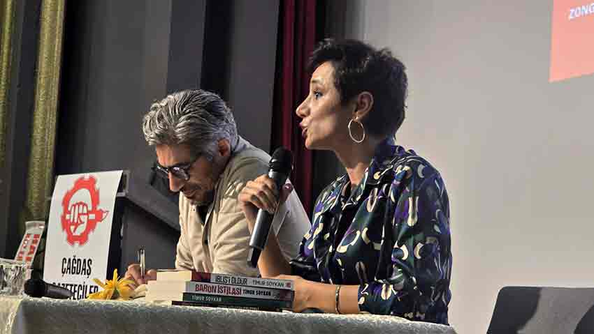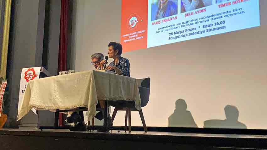 Söyleşinin açılışında, Zonguldak’la ilgili anılarını anlatan Şule Aydın, memleketinde olmanın mutluluğu içerisinde olduğunu aktardı. İBB operasyonları sonrasında her sabah saat 04:00’te uyandığını ve arkadaşlarını ulaşarak iyi olup olmadıklarını sorduğunu söyleyen Aydın, “Zor bir yaşam içerisinde devam ediyoruz.”dedi.