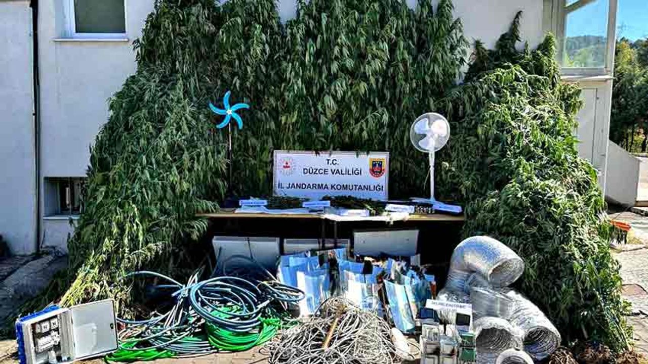 Açıklamada, "Cumhuriyet Başsavcılığımız koordinesinde Gümüşova İlçe Jandarma Komutanlığı, Narkotik Suçlarla Mücadele Şube Müdürlüğü ve Kaçakçılık ve Organize Suçlarla Mücadele Şube Müdürlüğü ekiplerince yapılan çalışmalar neticesinde, şüpheli A.Ö.’nün (65) kullanımında bulunan arazilere kenevir ekimi yaptığı tespit edilmiştir. Düzce 2. Sulh Ceza Hakimliğinin CMK 140. maddesi kapsamında alınan karar doğrultusunda ekim yapılan alanlara yerleştirilen foto kapanlarla şüphelinin kenevir bitkilerine bakım yaptığı görüntülenmiştir. Yapılan operasyonda 231 kök kenevir bitkisi, 210 gram kubar esrar, 502 gram skunk, iklimlendirme sistemi, hassas terazi, 100 metre sulama hortumu, 2 av tüfeği, 15 kartuş ve 16 adet 9 mm fişek ele geçirildi" denildi.