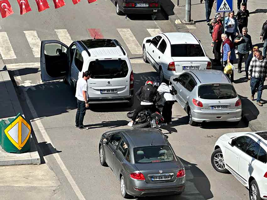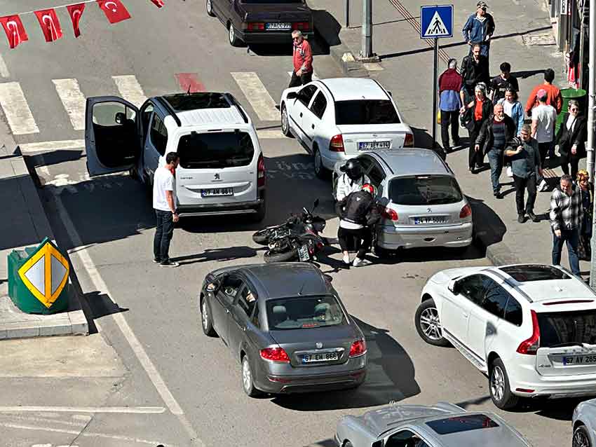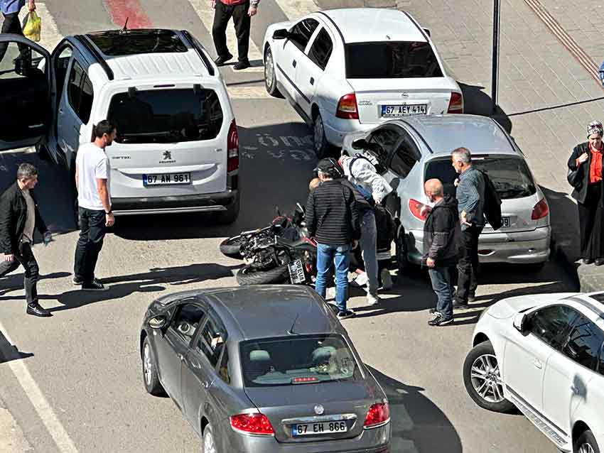 Zonguldak’ta valilik karşısında meydana gelen kazada, motosiklet sürücüsü kontrolünü kaybederek önündeki araca çarptı. Kazada yaralanan olmazken motosiklet ve araçta maddi hasar oluştu.