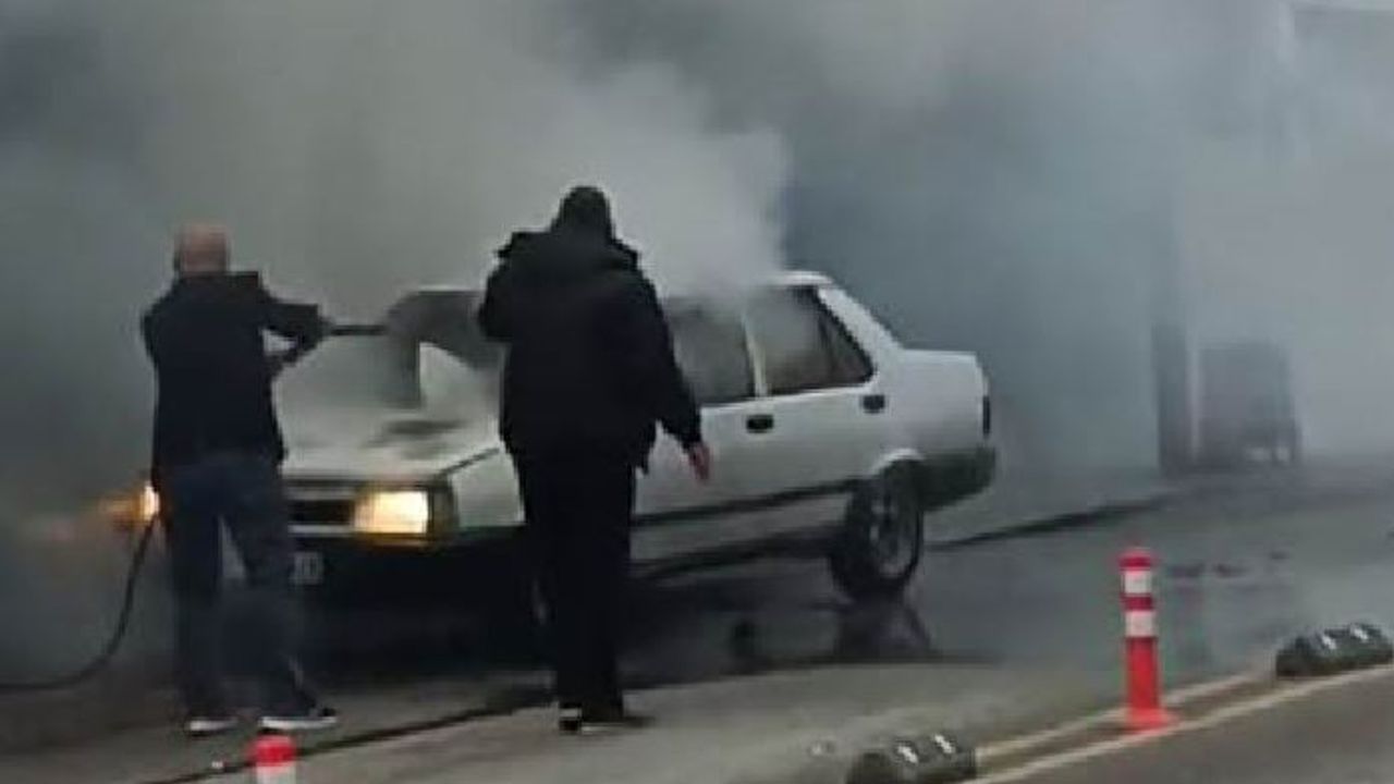 Sürücü, otomobili yol kenarında bulunan bir oto yıkama dükkanı önünde durdurdu. Durumu gören çevredeki esnaf, yangın söndürme tüpleriyle müdahale ederek alevlerin büyümesini engelledi.
