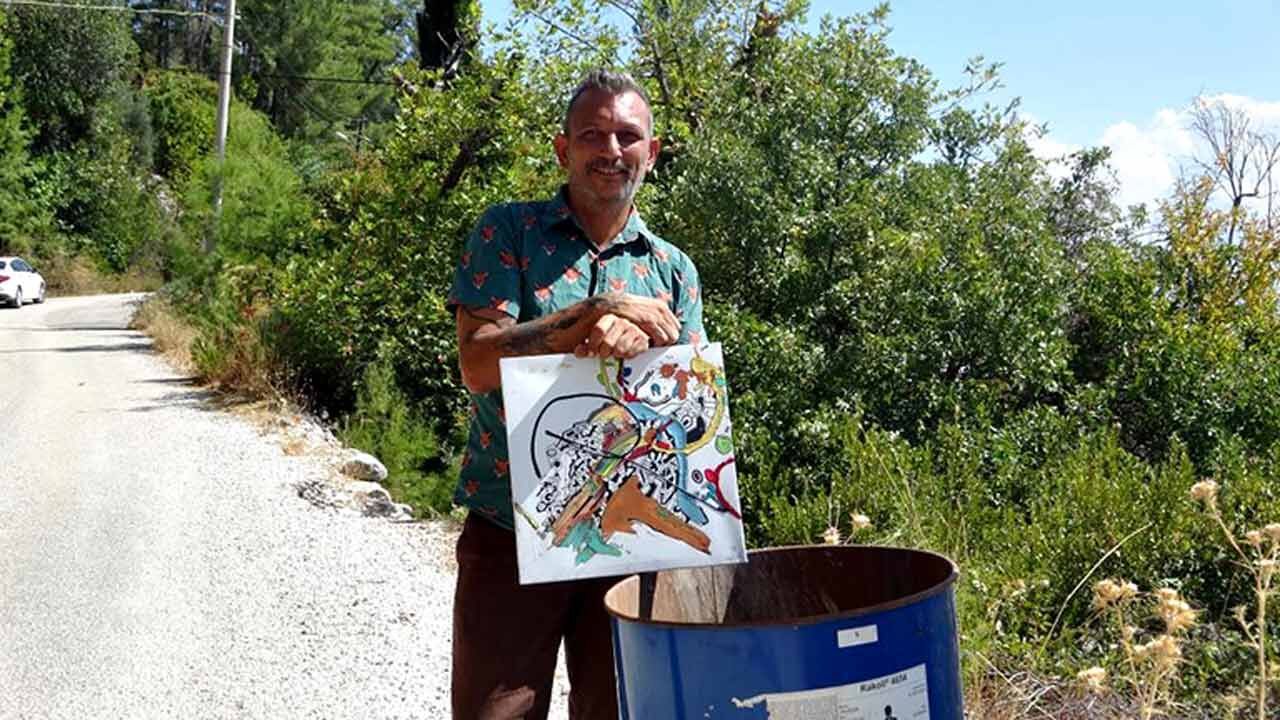 Kaş ilçesinde yaşayan ressam Efe Işıldaksoy (50), 11 yıldır yaptığı tablolarını çöpe atıyor. Bugüne kadar dünyanın farklı ülkelerinde 2 bin 175 resmini çöp kutularının kenarına bırakan Işıldaksoy, 2 bin 175'inci eserini Kaş Ortabağ'da haber çekimleri sırasında çöp bidonunun üzerine astı.