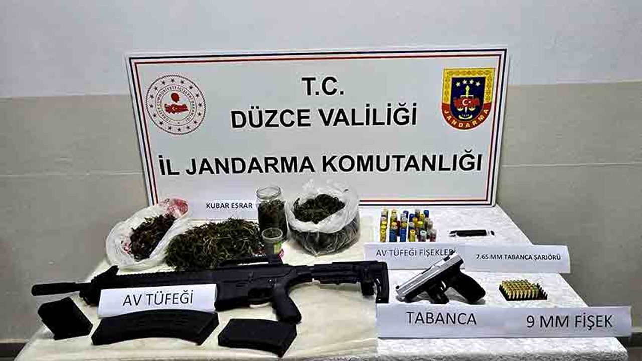 Düzce Cumhuriyet Başsavcılığı koordinesinde jandarma ekiplerince yapılan çalışmalarda Gölyaka ilçesinde M.Ş isimli şahsın evinde ve bahçesinde uyuşturucu madde bulundurduğuna yönelik duyum alındı. Alınan istihbarı bilgiler kapsamda; Cumhuriyet Başsavcılığından alınan arama kararı sonrası şahsın evi, eklentilerinde yapılan arama sonucunda 500 gram kubar esrar, 1 adet tabanca, 2 adet şarjör, 38 adet 9 mm çapında tabanca fişeği, 1 adet 7.65 mm çapında tabanca şarjörü, 1 adet yivsiz av tüfeği, 3 adet yivsiz av tüfeği şarjörü, 38 adet av tüfeği kartuşu ele geçirildi. Şahıs gözaltına alınırken, hakkında adli işlem başlatıldığı öğrenildi.