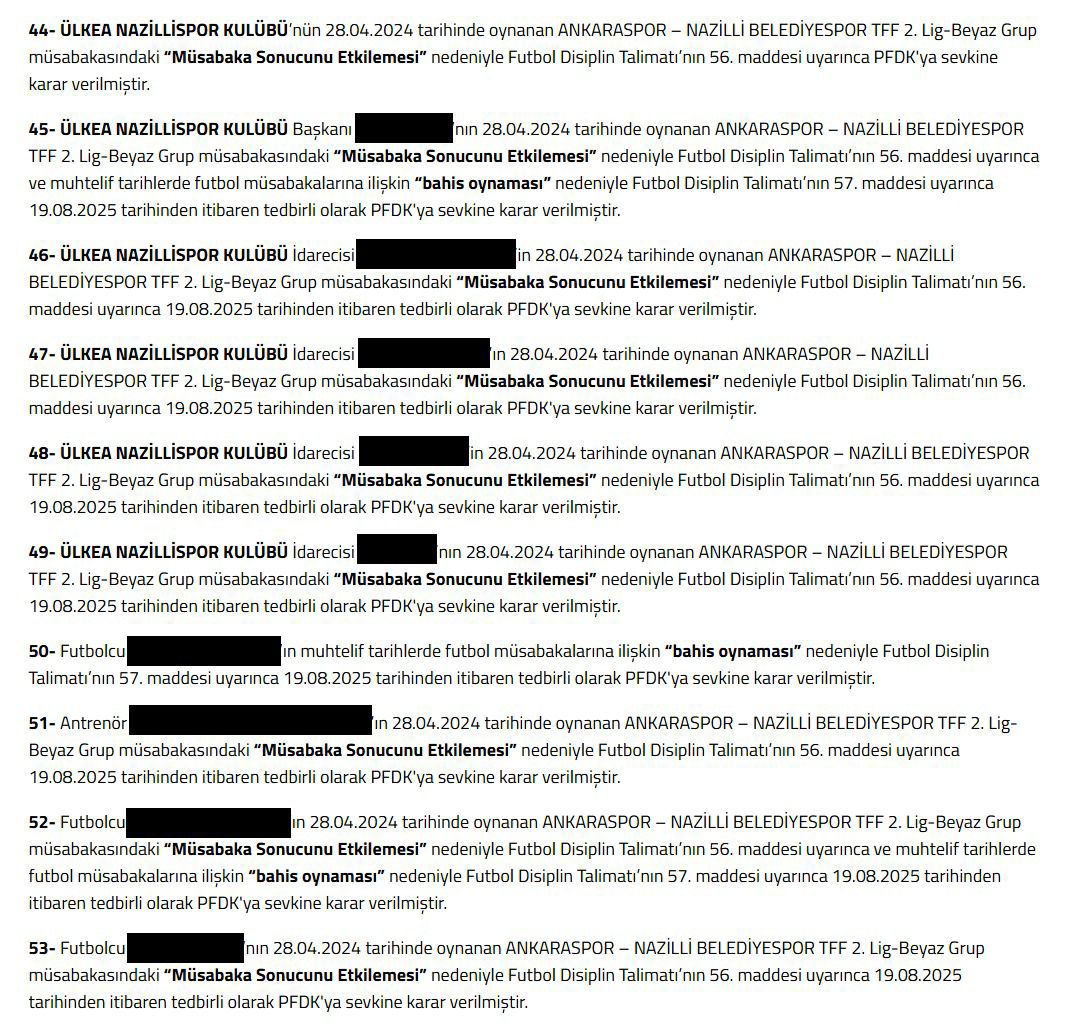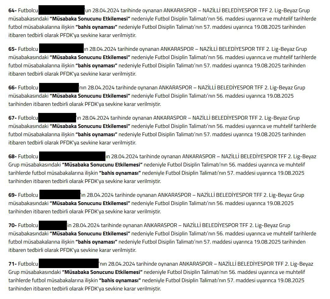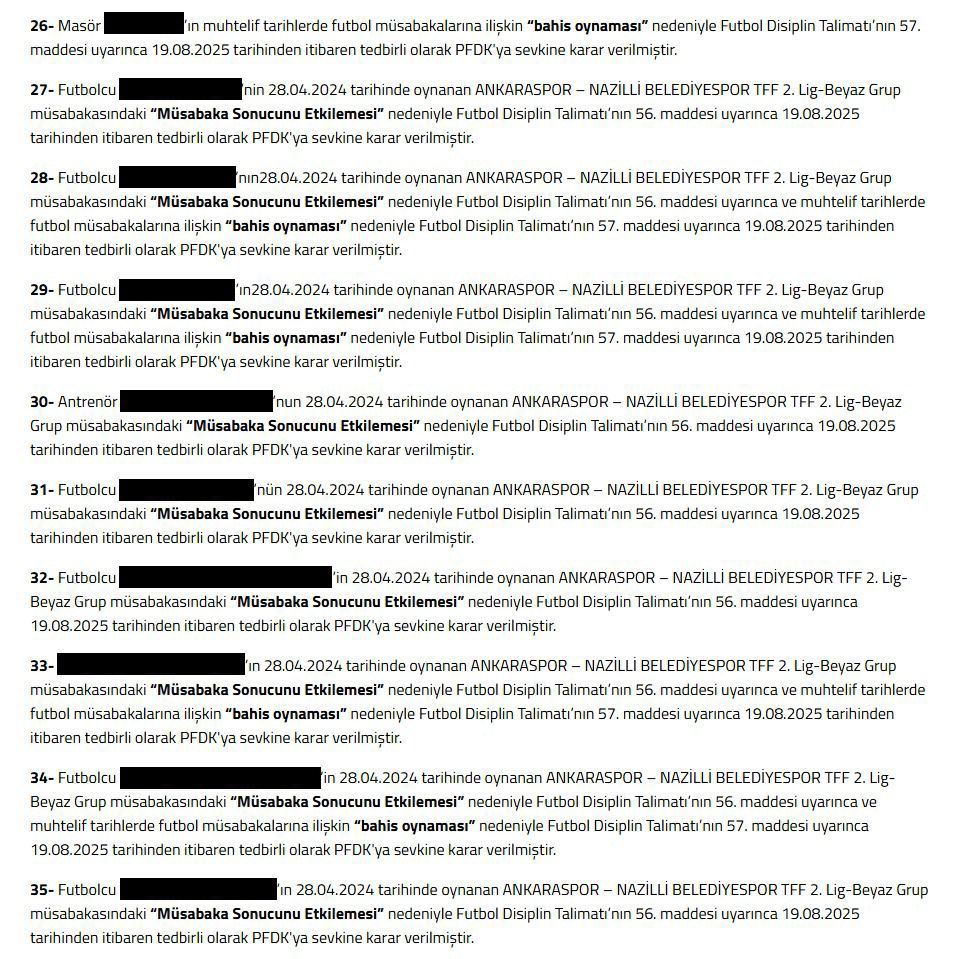 “Suçüstü yaptığımız şaibeli maç disipline taşındı” diyen Yavuzyılmaz, TFF Hukuk Müşavirliği’nin, Ankaraspor ve Nazillispor kulüpleri ile kulüp başkanları, yöneticileri, futbolcuları ve hatta masörleri dahil olmak üzere toplam 54 kişiyi “müsabakanın sonucuna etki etmek ve bahis oynamak” gerekçesiyle Profesyonel Futbol Disiplin Kurulu’na (PFDK) sevk ettiğine dikkat çekti.