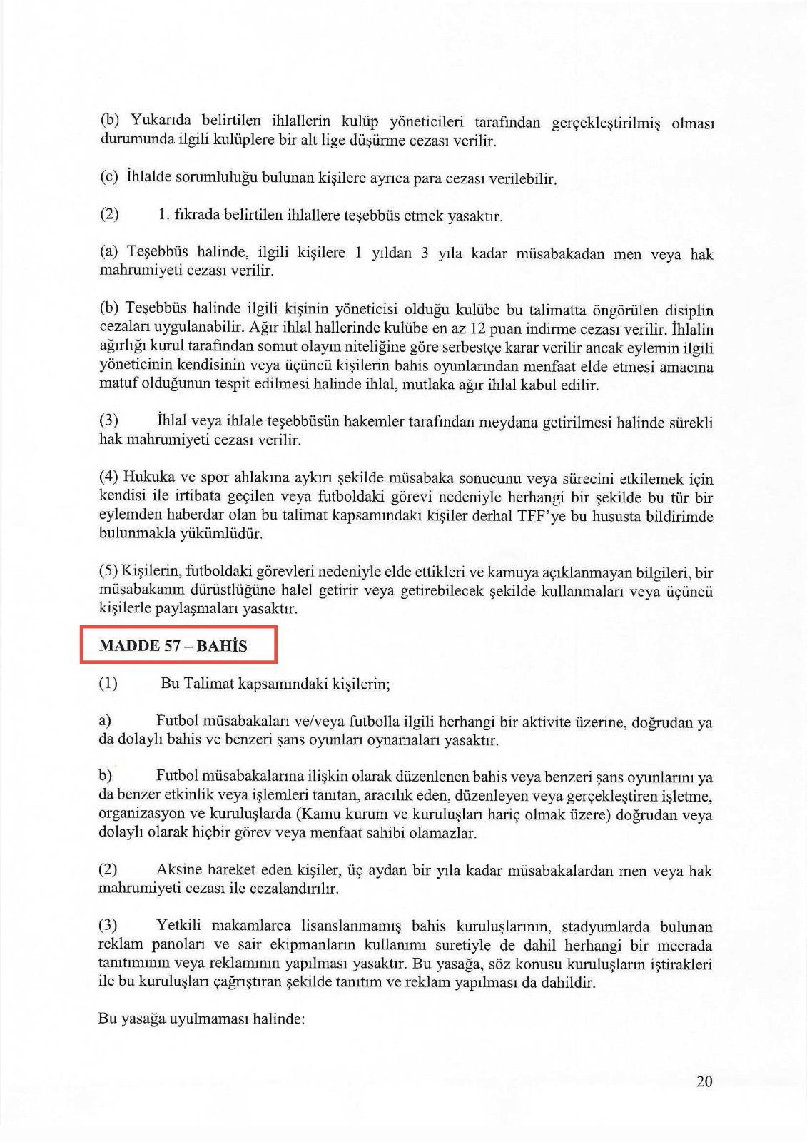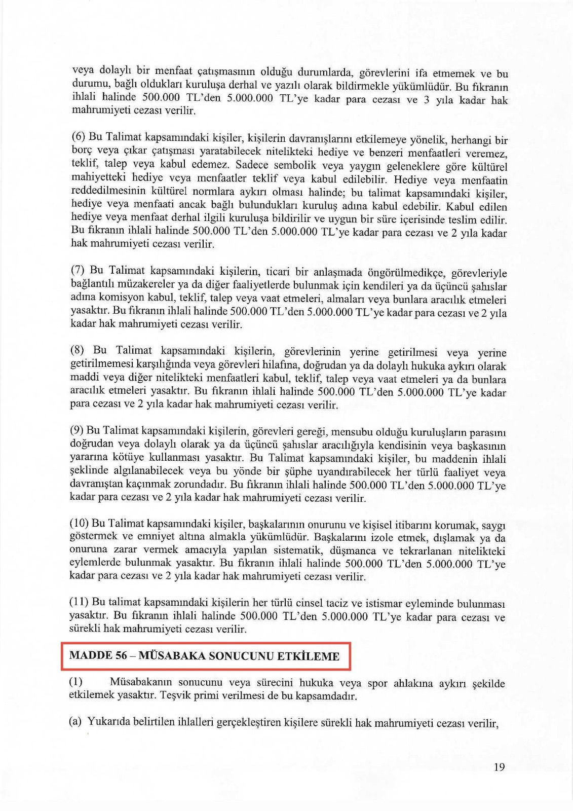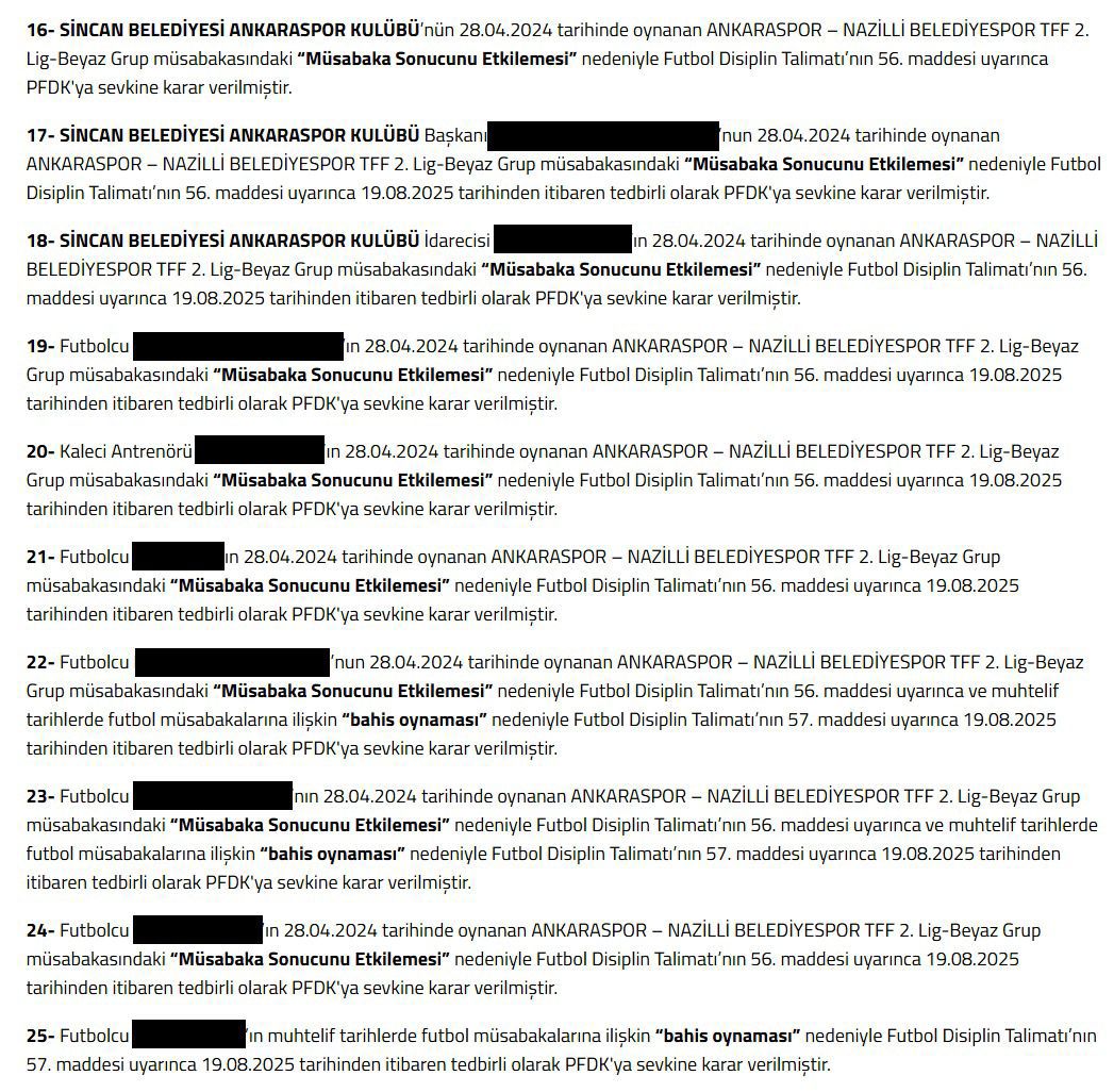 “Suçüstü yaptığımız şaibeli maç disipline taşındı” diyen Yavuzyılmaz, TFF Hukuk Müşavirliği’nin, Ankaraspor ve Nazillispor kulüpleri ile kulüp başkanları, yöneticileri, futbolcuları ve hatta masörleri dahil olmak üzere toplam 54 kişiyi “müsabakanın sonucuna etki etmek ve bahis oynamak” gerekçesiyle Profesyonel Futbol Disiplin Kurulu’na (PFDK) sevk ettiğine dikkat çekti.