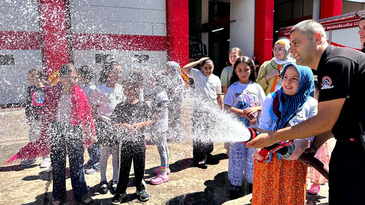 Öğrenciler itfaiyecilik mesleğini yerinde tanıdı, hortumu ellerine alıp doyasıya eğlendi.